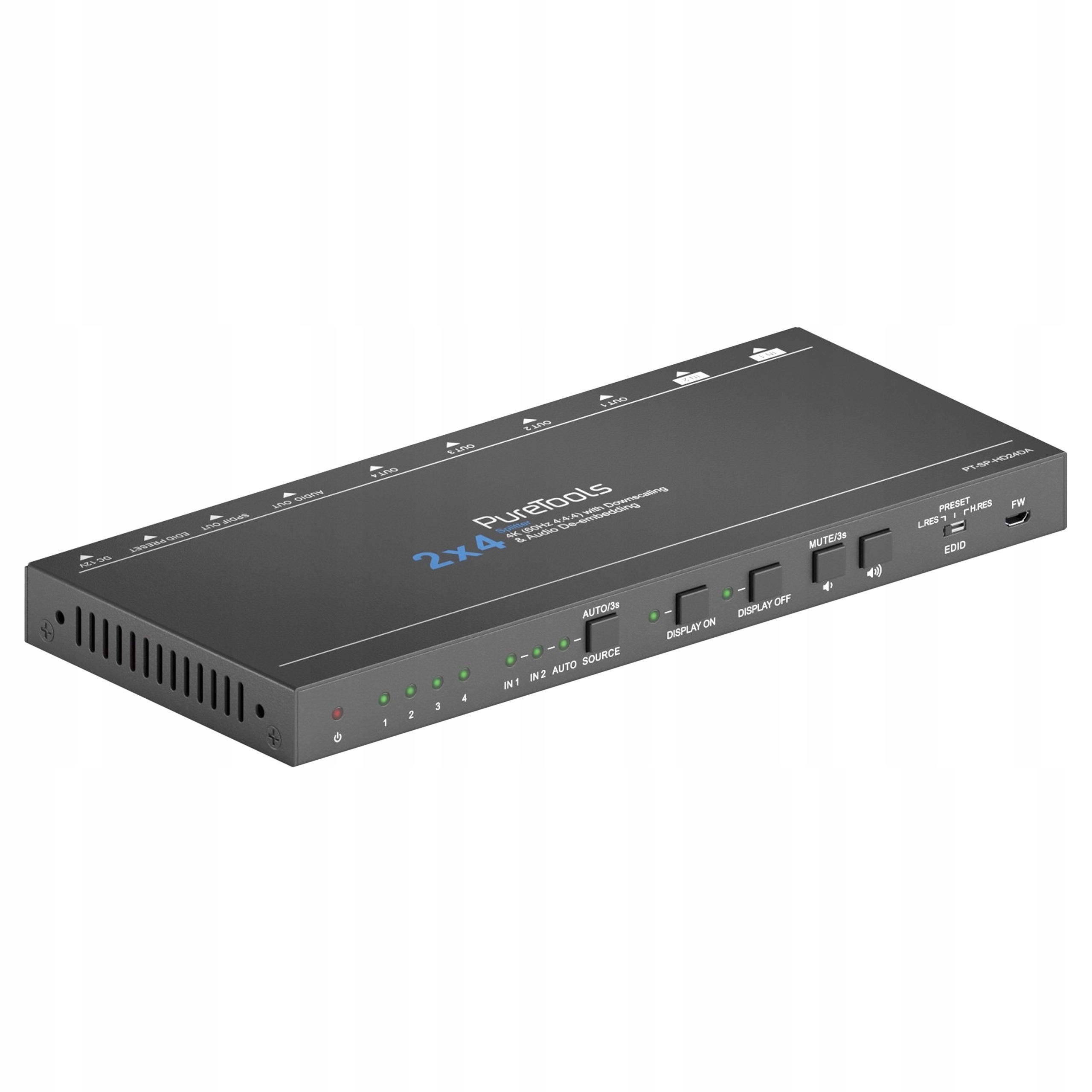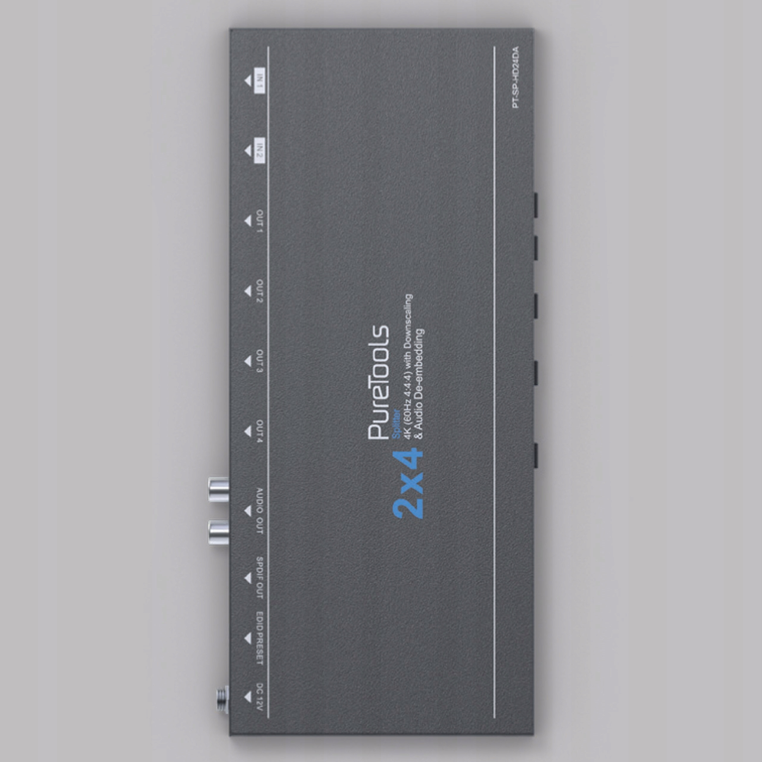 Сплітер PT-SP-HD24DA із лінії PureTools забезпечує дублювання без втрат і розподіл сигналу з двох джерел HDMI 4K на чотири дисплеї, забезпечуючи безпомилковий вміст відтворення без втрати цілісності сигналу.
