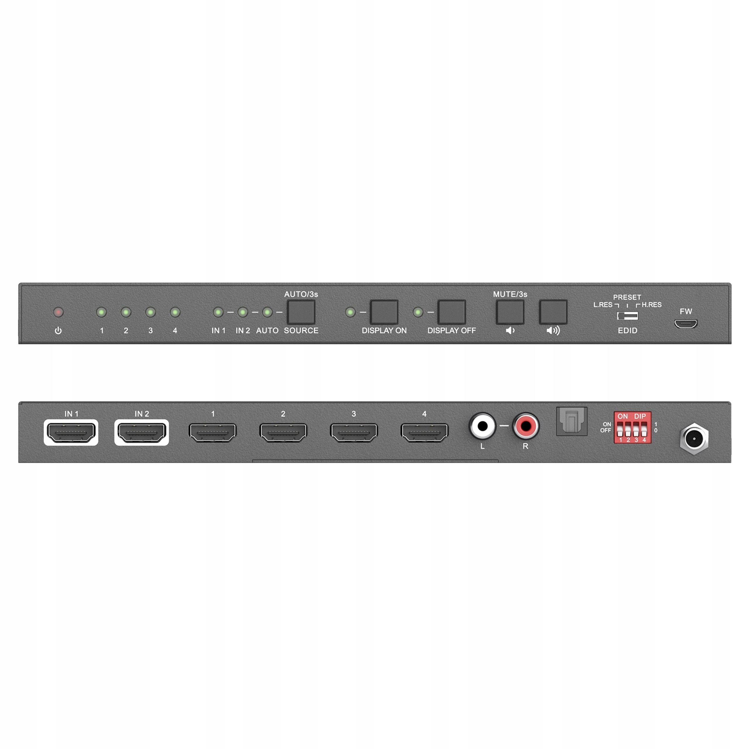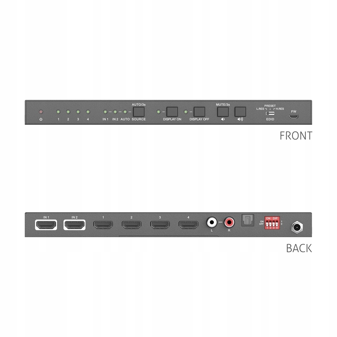 - Керування: 3-контактний DIP-перемикач EDID, 4-контактний DIP-перемикач EDID, за допомогою фізичних кнопок