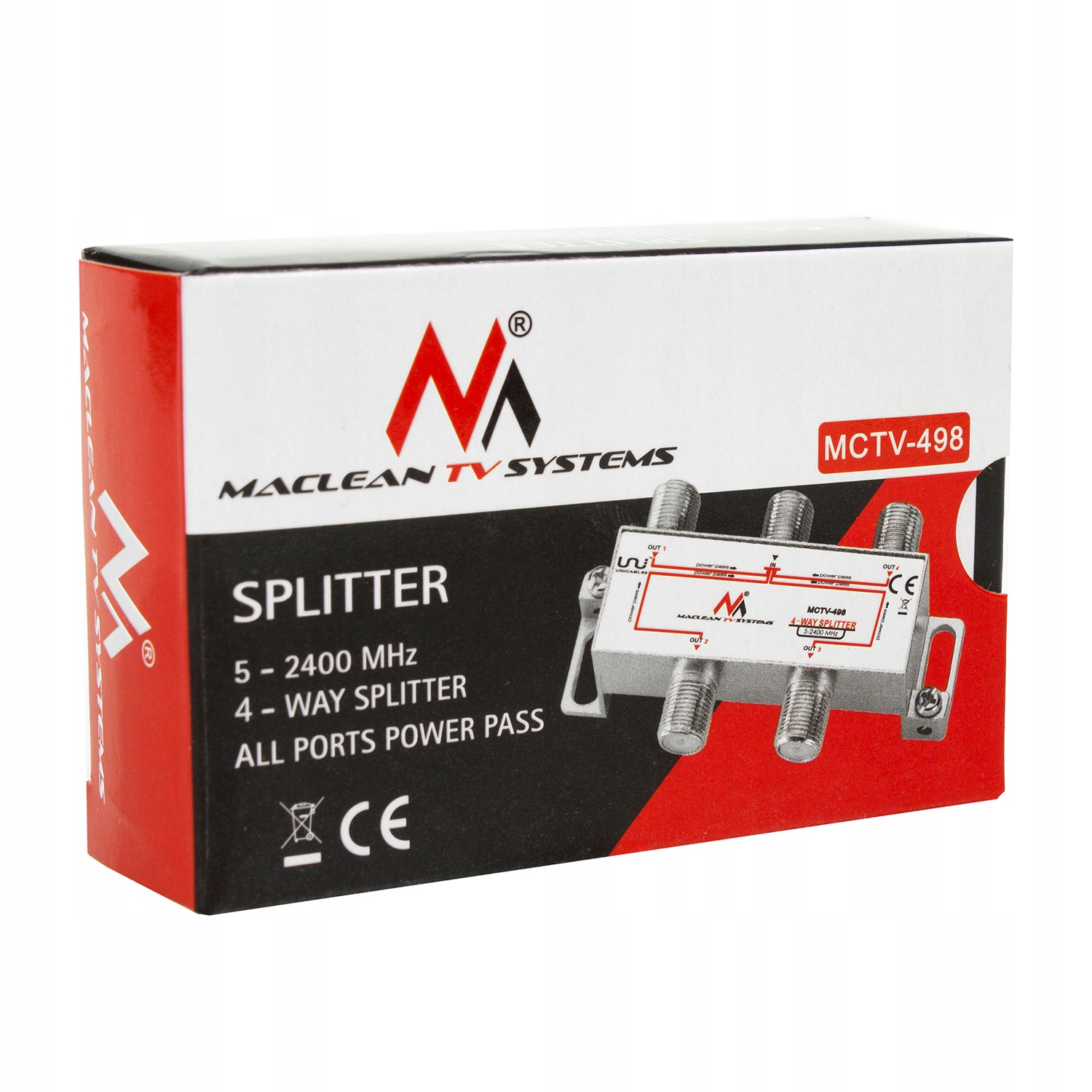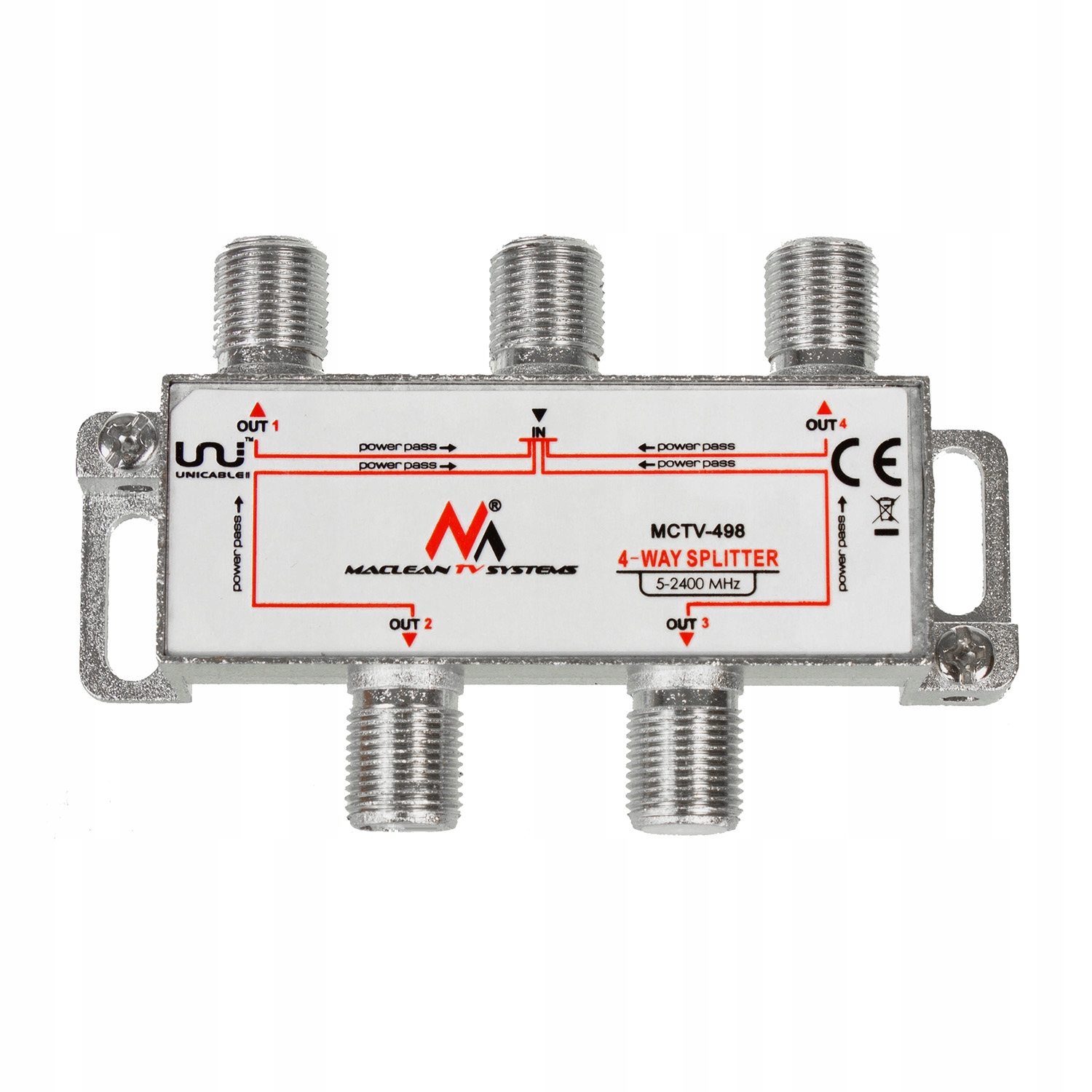 Високоякісний розгалужувач/розгалужувач сигналу Maclen, модель MCTV -498дозволяє поширювати сигнал антени з одного входу на чотири приймачі. Сплітер передає напругу з виходів на вхід, тому живлення антени можна підключити до одного з приймачів.