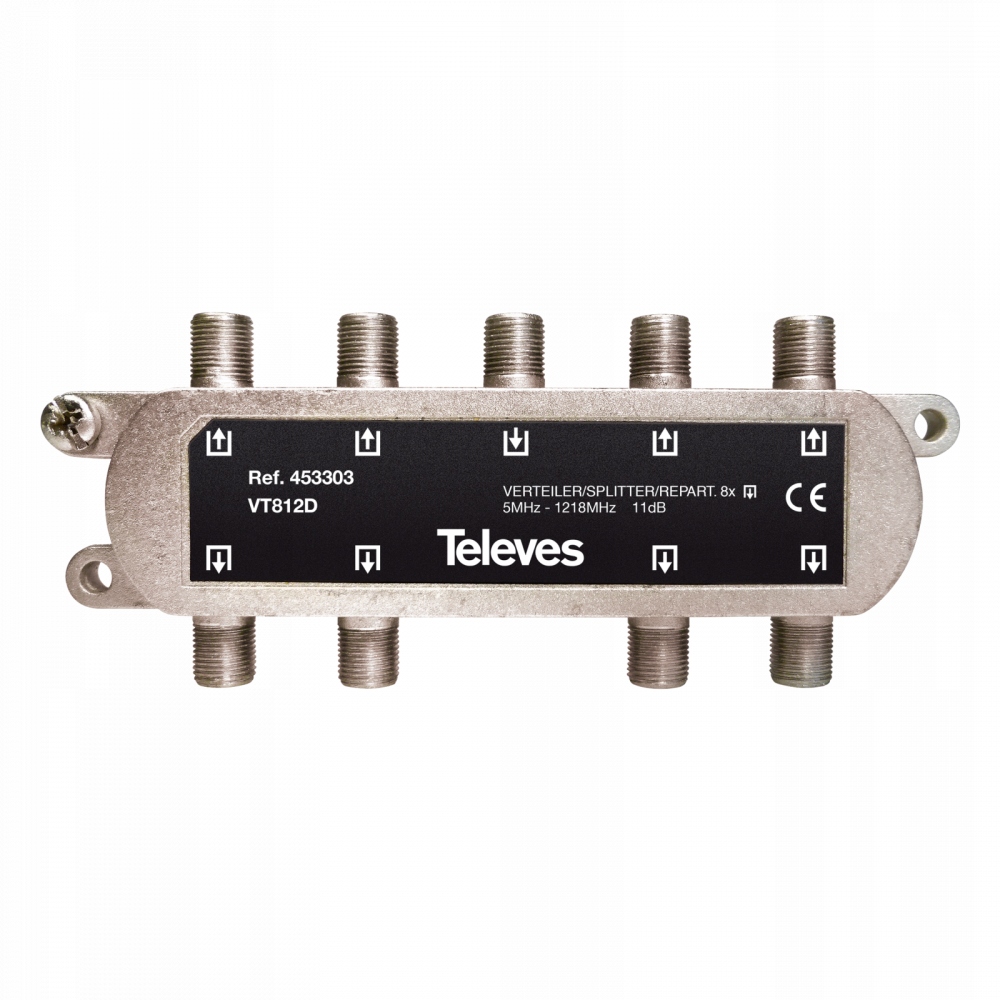 8-канальний розгалужувач із роз'ємами F для сигналів RTV і SAT. Його можна використовувати для підключення восьми приймачів. Він не має переходу напруги. Корисно для кабельного телебачення та пасивних антен DVB-T.
