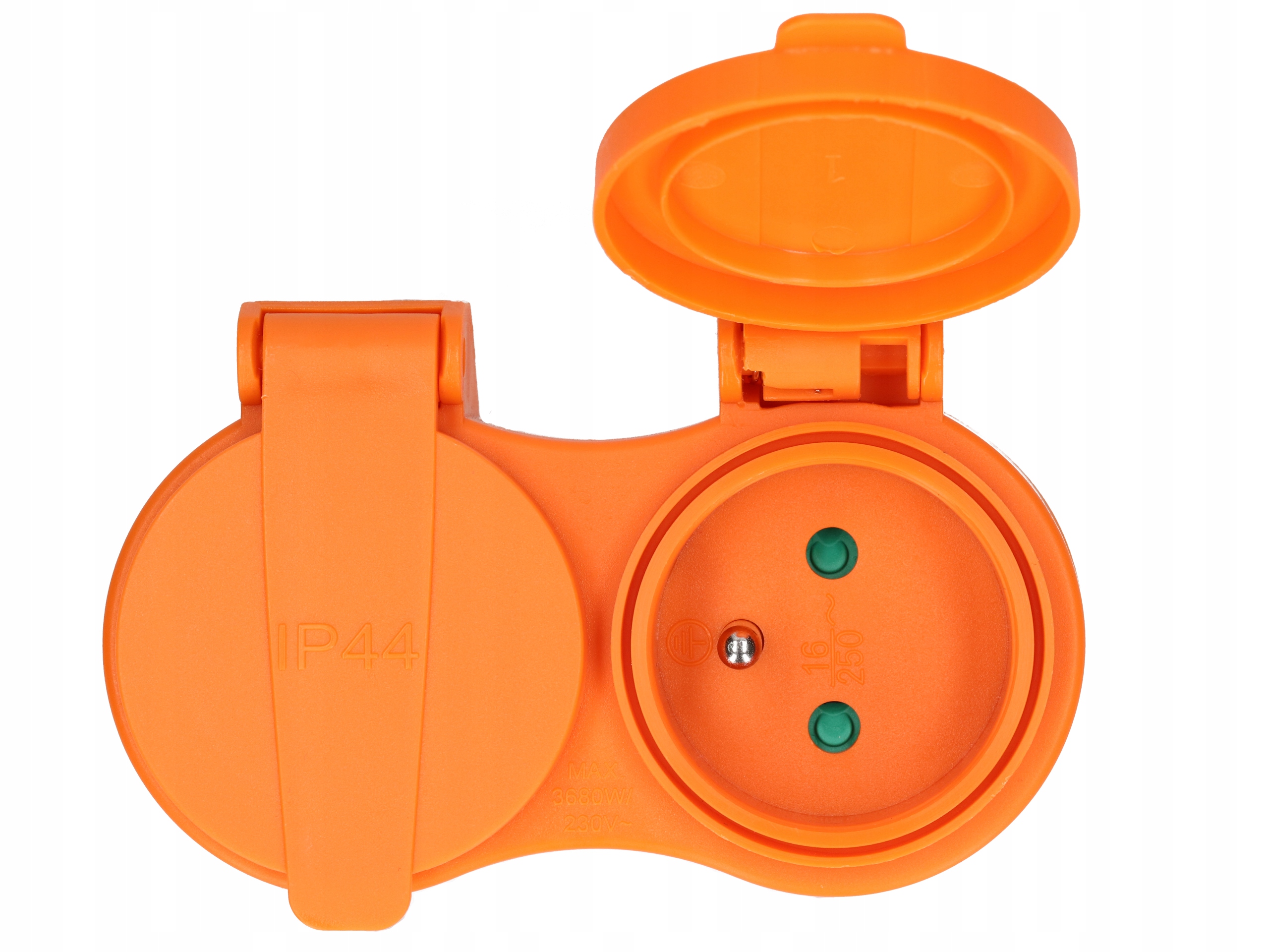 Функціональний подвійний розгалужувач, має два круглі роз'єми, закріплені клапанами. адаптований для використання в розетках із заземленням.