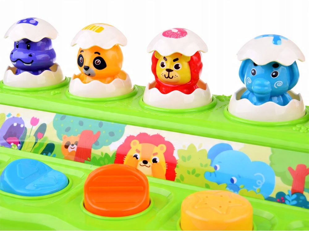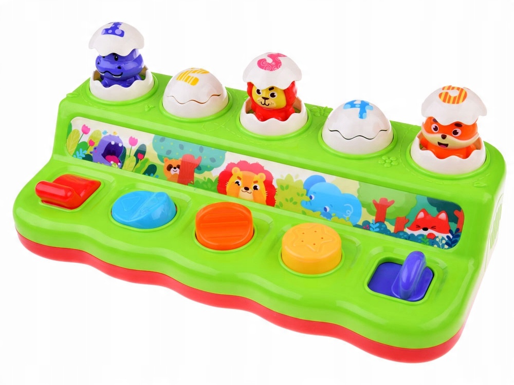 Весела інтерактивна іграшка для тренування рук вашої дитини. Іграшка зі спливаючими тваринами виконана дуже привабливо - зелена графіка з милими звірятками, які ховаються у своїх яйцях.