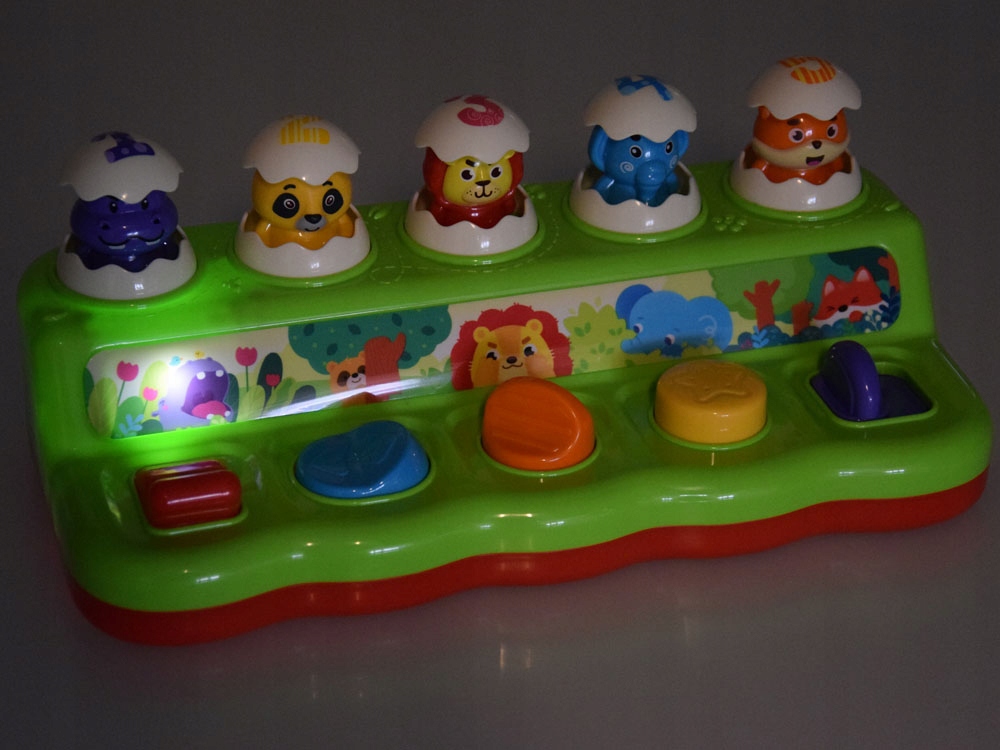 Вчить вашу дитину користуватися кнопками, ручками, натискати й тягнути. Якщо натиснути джойстик, перемикач, ручку чи кнопку перед ними, тварина вистрибне з яєчної шкаралупи.