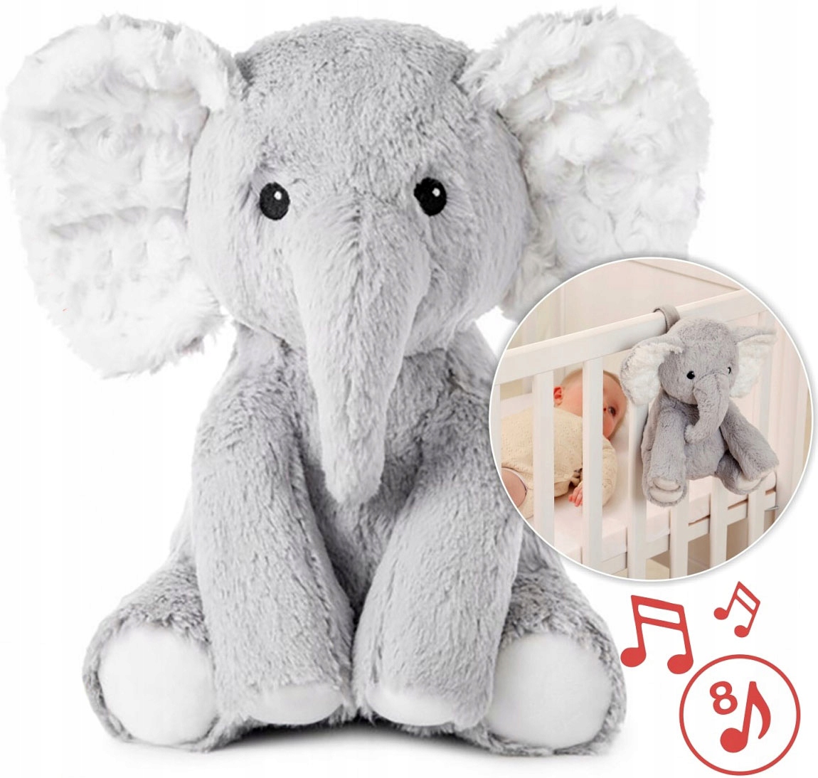 Простий у використанні. М'яка чарівна м'яка іграшка має застібку-липучку, завдяки якій ви легко зможете прикріпити улюбленого компаньйона вашого малюка до ліжка, коляски або автокрісла. А коли слону потрібно викупатися, просто зніміть звукову панель і киньте талісман у ванну.