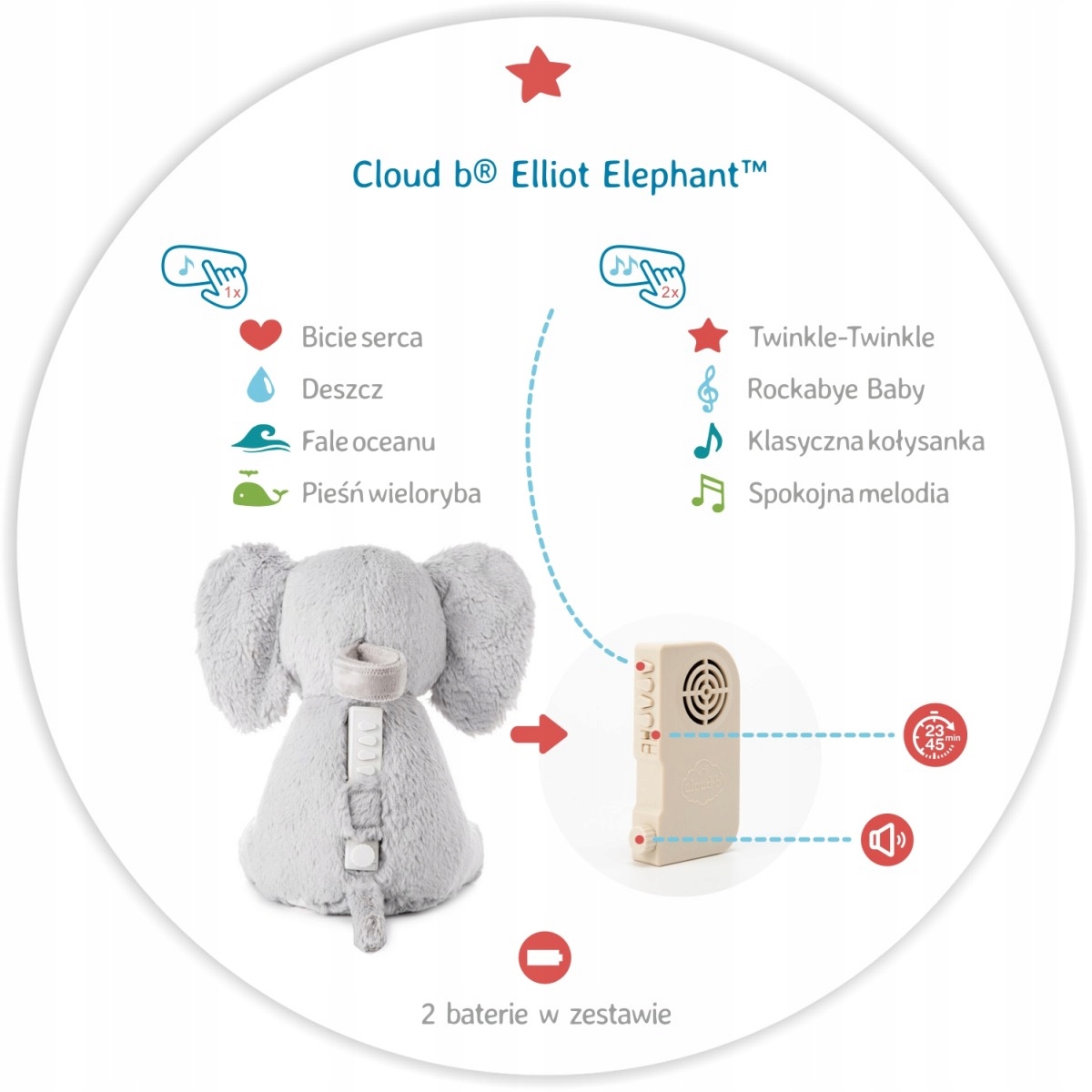 Покладіть дитину спати за 5 хвилин. Чарівне слоненя має 8 варіантів розслаблюючих звуків, у тому числі звук серцебиття, який імітує заспокійливі звуки, відомі дитині з утроби матері. Музична шкатулка також відтворює чотири колискові, які сподобаються і батькам, і дитині, наприклад популярна Rockabye Baby. Такий музичний ритуал перед сном допоможе заснути навіть самим плаксивим дітям!