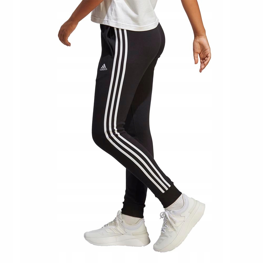 Adidas Essentials 3-Stripes French Terry Cuffed Pants – це жіночі спортивні штани чорного кольору з трьома контрастними смугами вздовж штанин. Приталений крій надає моделі спортивний вигляд, а еластична талія, що регулюється шнурком, фіксує модель. Жіночі спортивні штани adidas Essentials 3-Stripes French Terry Cuffed Pants призначені для тренувань і повсякденного використання.