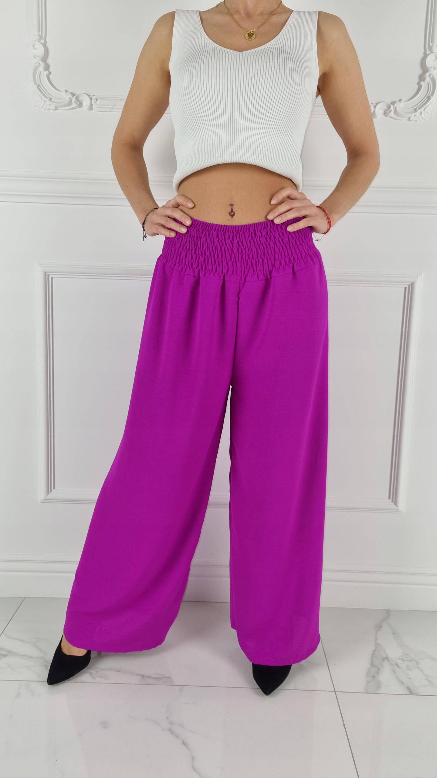 Широкі жіночі брюки незамінний елемент жіночого гардеробу. Вони мають еластичну стрічку на талії, яка забезпечує чудову підтримку, але не обтягує. Модель надзвичайно зручна і забезпечує максимальний рівень комфорту. Матеріал ідеально сидить по фігурі, не облягає і не прозорий. Вони ідеально підходять для створення як елегантного, так і повсякденного стилю.