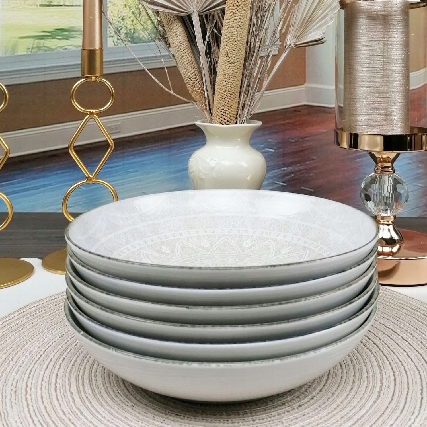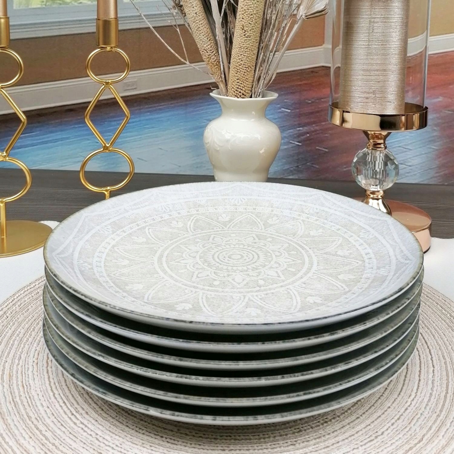 - Кожна тарілка прикрашена складним геометричним орнаментом перламутрових відтінків білий і пісочно-бежевий, що створює ефект ручного гравіювання.