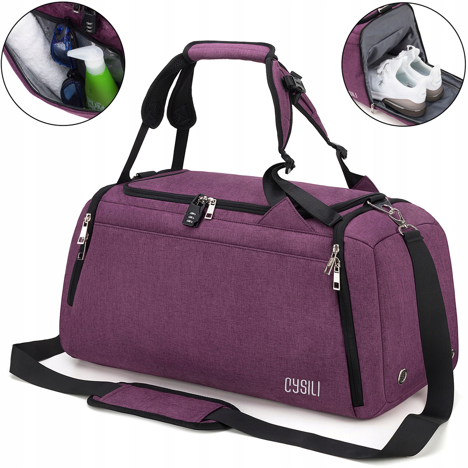 СПОРТИВНА ДОРОЖНЯ СУМКА НА ПЛЕЧІ 42L + КИШЕНЯ ДЛЯ ВЗУТТЯ ФІОЛЕТОВА