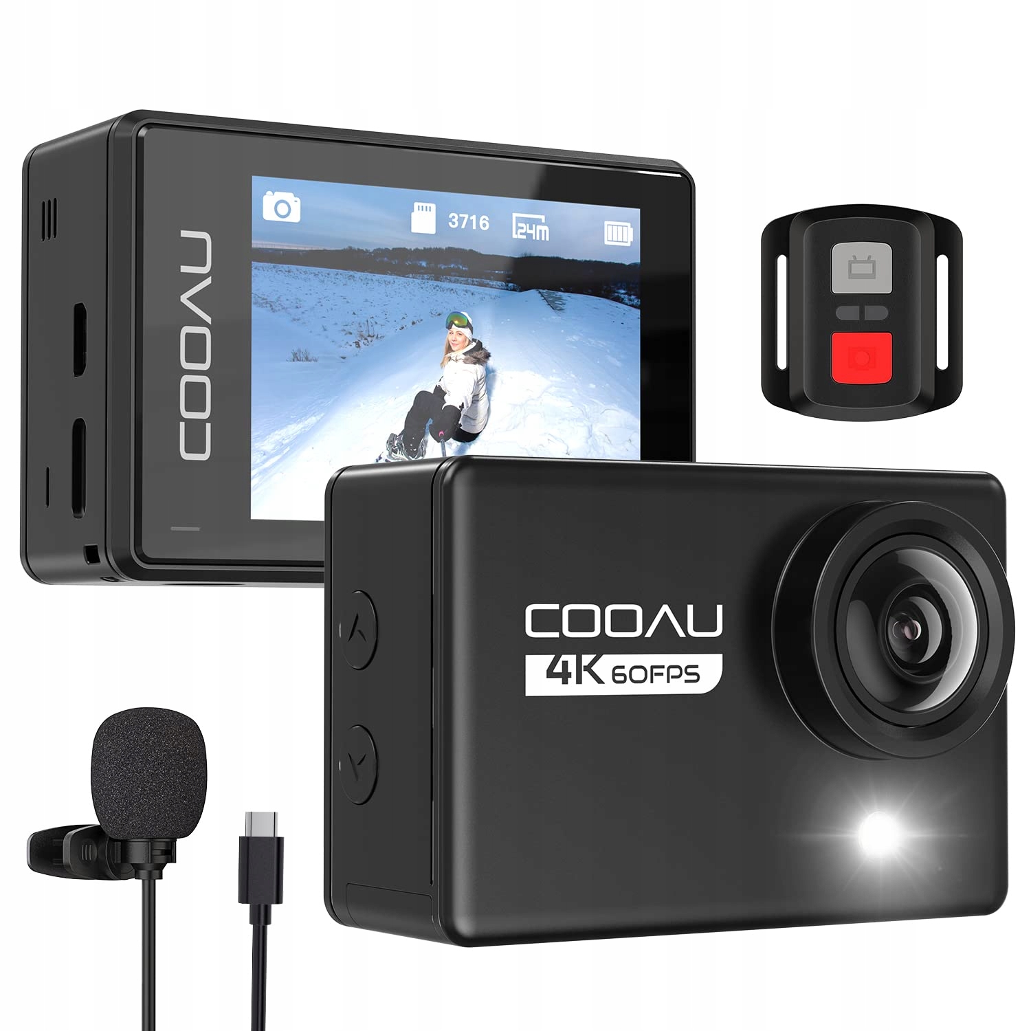 Камера COOAU оснащена бездротовим пультом дистанційного керування 2,4G, який дозволяє дистанційно керувати камерою в радіусі 10 МБ. Він також оснащений 2* 1350mAh акумуляторами та зовнішнім мікрофоном. Велика кількість аксесуарів робить камеру ідеальною для різних спортивних сценаріїв, таких як підводне плавання, серфінг, їзда на велосипеді, мотоциклі, катання на лижах тощо.
