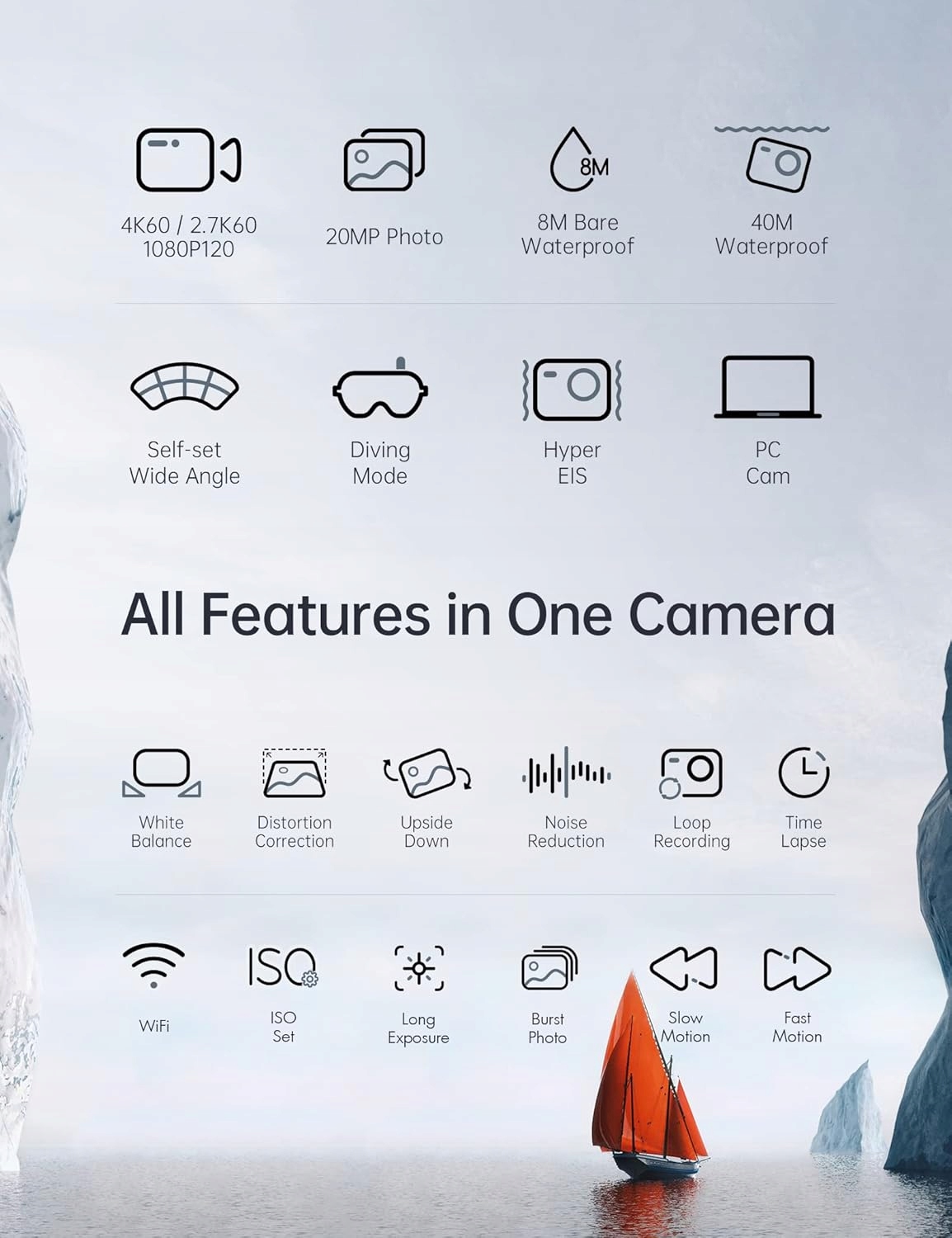 Дійова камера WOLFANG GA400 — це рідна камера 4K, яка пропонує роздільну здатність відео до 4K із частотою кадрів 60 кадрів/с, щоб зафіксувати всі деталі вашої пригоди. Роздільна здатність фотозйомки може досягати 20 МП, що чітко відтворює фотографовану сцену та захоплює красиве зображення в момент зйомки.