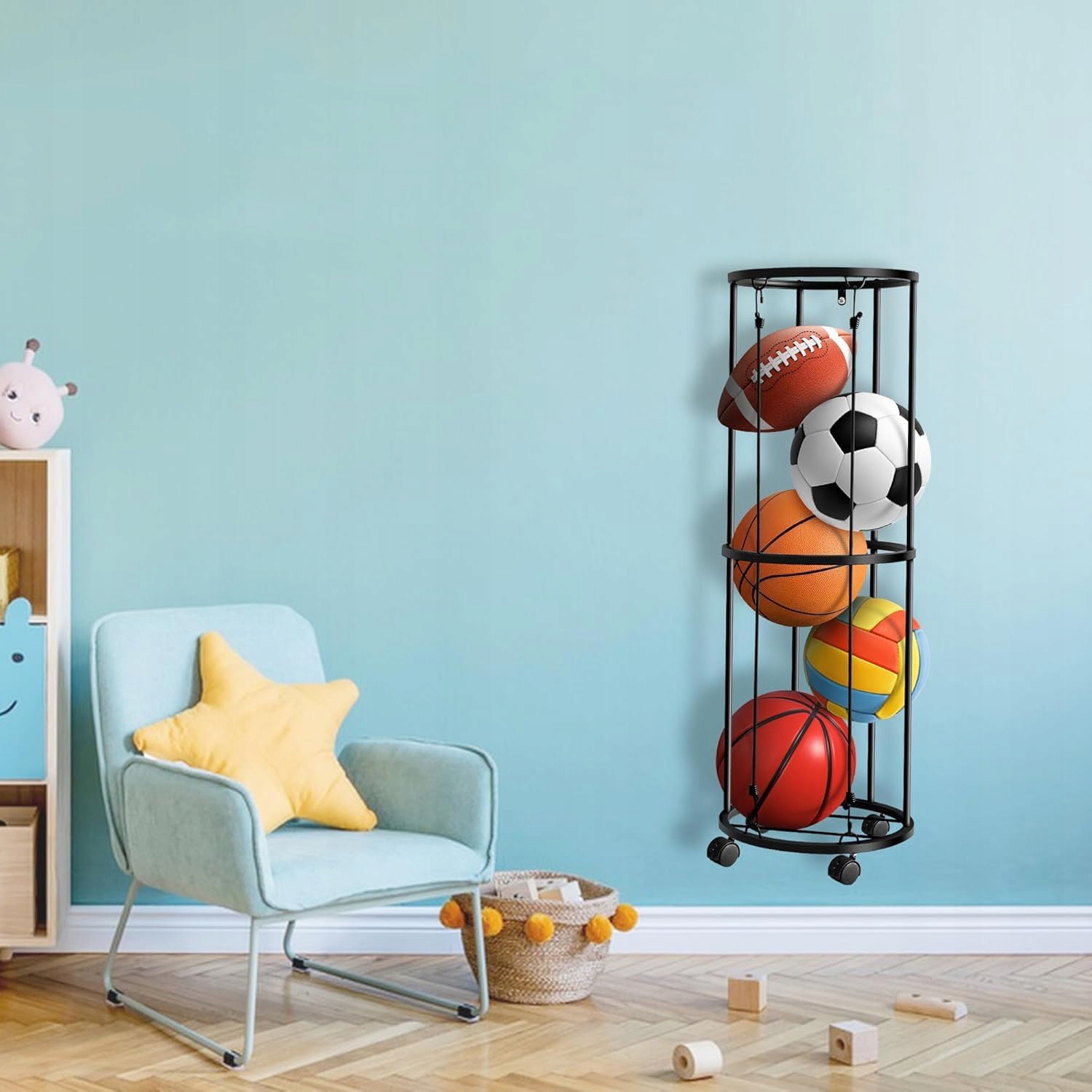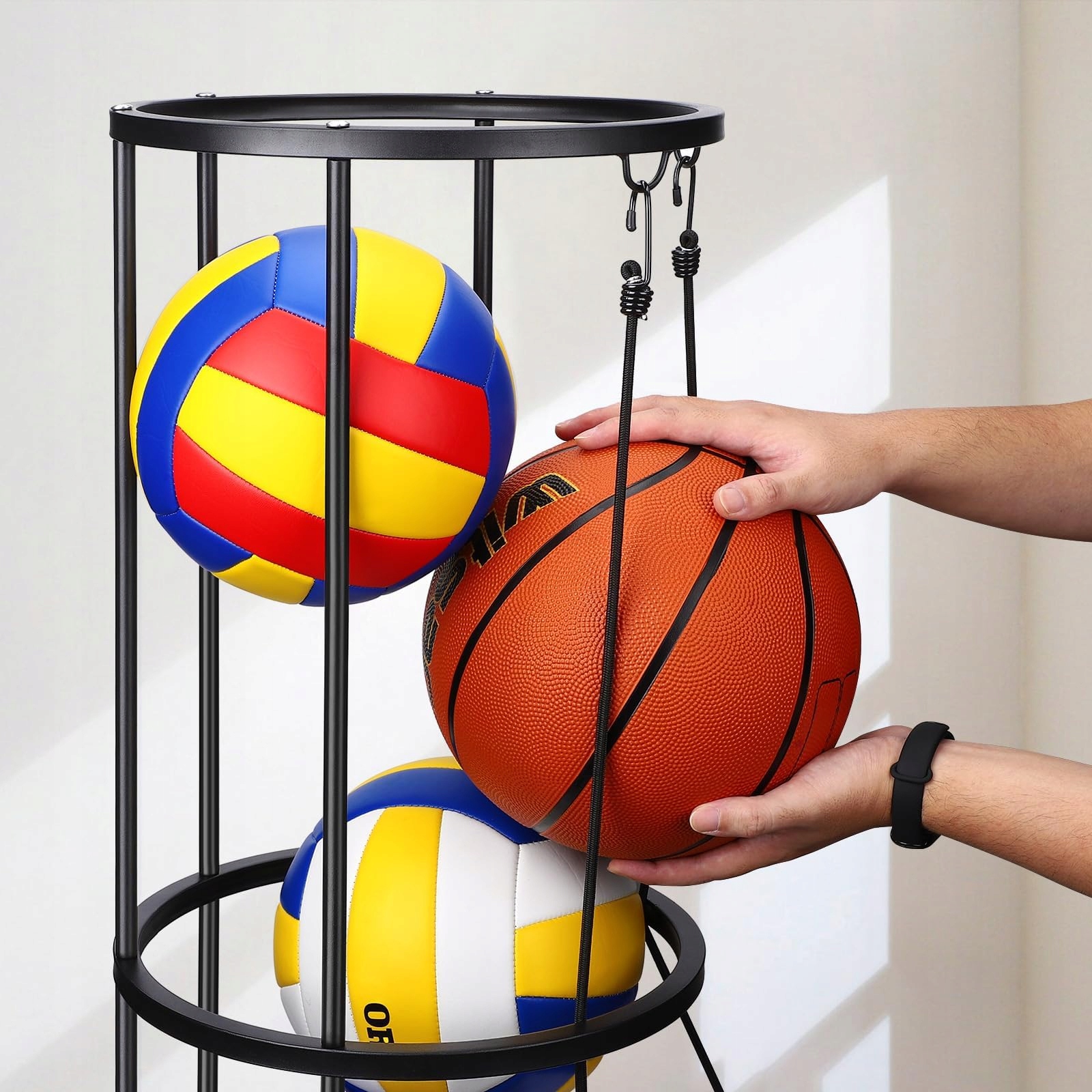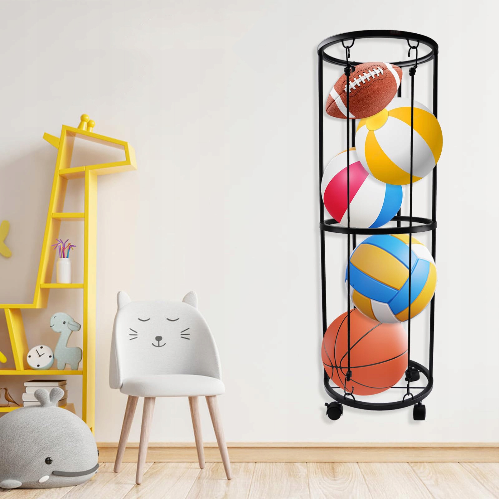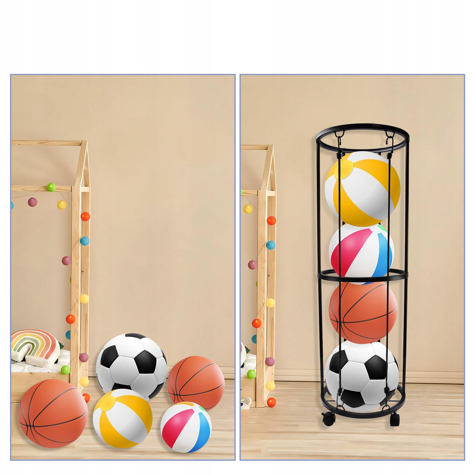 Stojak na piłki montowany na ścianie z kółkami, który zaprojektowaliśmy w kształcie walca, oszczędza miejsce, jednocześnie Zwiększając przestrzeń do przechowywania. Ця стенд для гри є практичним для зберігання різних спортивних м'ячів. Він може вмістити п’ять баскетболу, футболу, волейболу та інших великих кульок, але він також може вмістити кілька м'ячів для бадмінтону, тенісу та інших маленьких кульок.