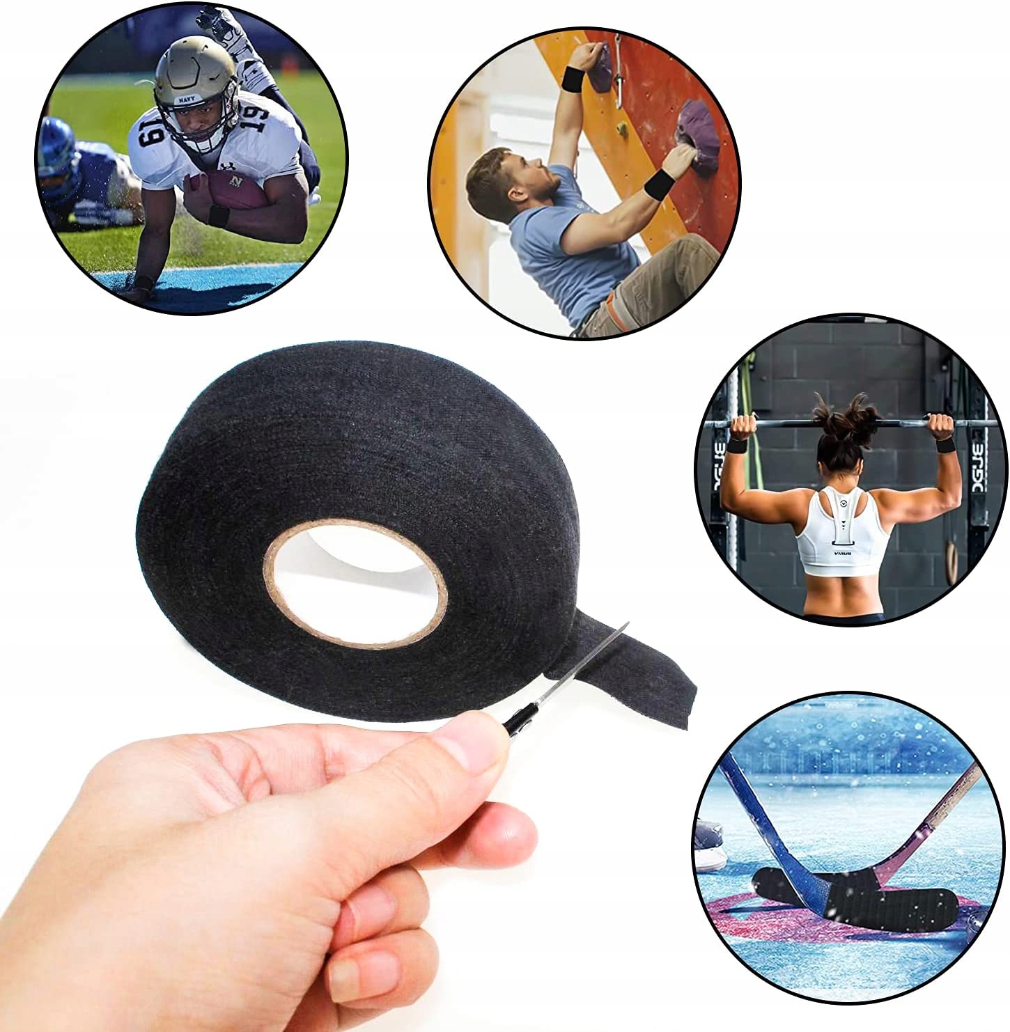🟠стрічка для захвату може використовуватися для багатьох типів захватів (види спорту), таких як: підтягування, паралелі, гімнастичні кільця, сквош, бадмінтон, палиці для гольфу та хокею, велосипедні ручки, вудки, ручки для колясок, палиці для ходьби тощо.