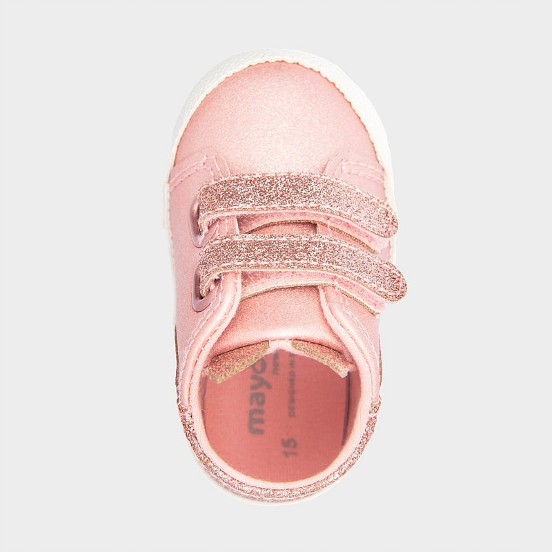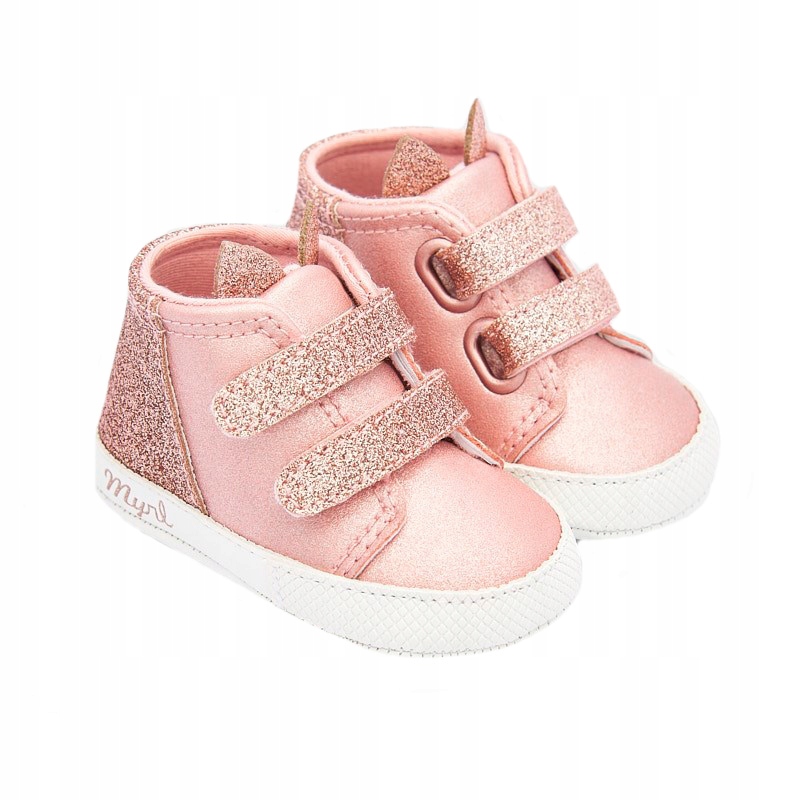 Спортивне взуття для новонародженої дівчинки, яке можна використовується універсально кожен день. Застібка регулюється за допомогою двох липучок, що забезпечує швидке надягання та більш точне прилягання до ноги. Декор: вушні аплікації, металеві деталі, гліттер. Цей товар упакований у коробку з лінії Newborn, ідеально підходить для особливих випадків.