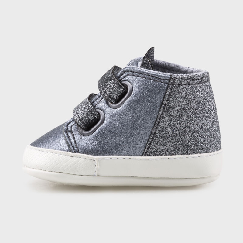 Спортивне взуття для новонародженої дівчинки, яке можна використовується універсально кожен день. Застібка регулюється за допомогою двох липучок, що забезпечує швидке надягання та більш точне прилягання до ноги. Декор: вушні аплікації, металеві деталі, гліттер. Цей товар упакований у коробку з лінії Newborn, ідеально підходить для особливих випадків.
