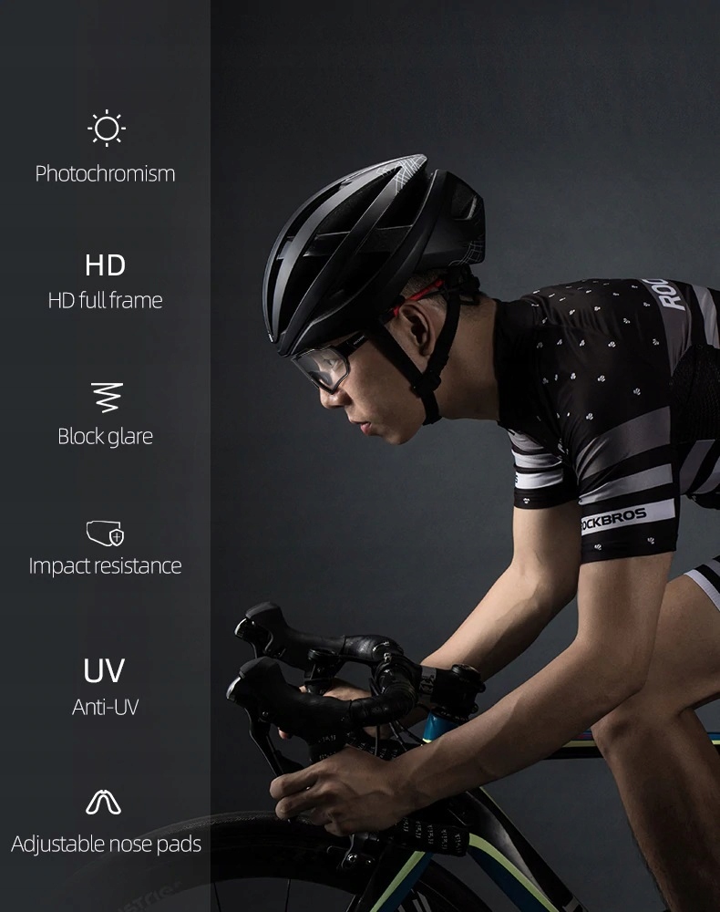 Універсальні спортивні окуляри від Rockbros, які ідеально підходять для їзди на велосипеді, бігу та інших видів спорту. Завдяки використанню фотохромних лінз вони автоматично затемнюються залежно від умов освітлення.