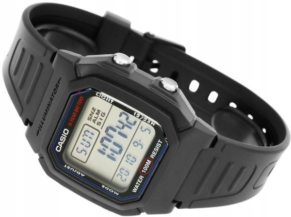 Casio W-800H-1AV є водонепроникним до 10ATM (100 м), тому ви можете вільно плавати з ним. Годинник оснащений такими функціями, як: подвійний час (поточний час у двох часових поясах), секундомір, що вимірює час до 24 годин з точністю до 1/100 секунди, один мультибудильник з функцією повтору, повний годинний сигнал, автоматичний календар (автоматично регулює дату з урахуванням високосних років), 12-24-годинний режим відображення часу.