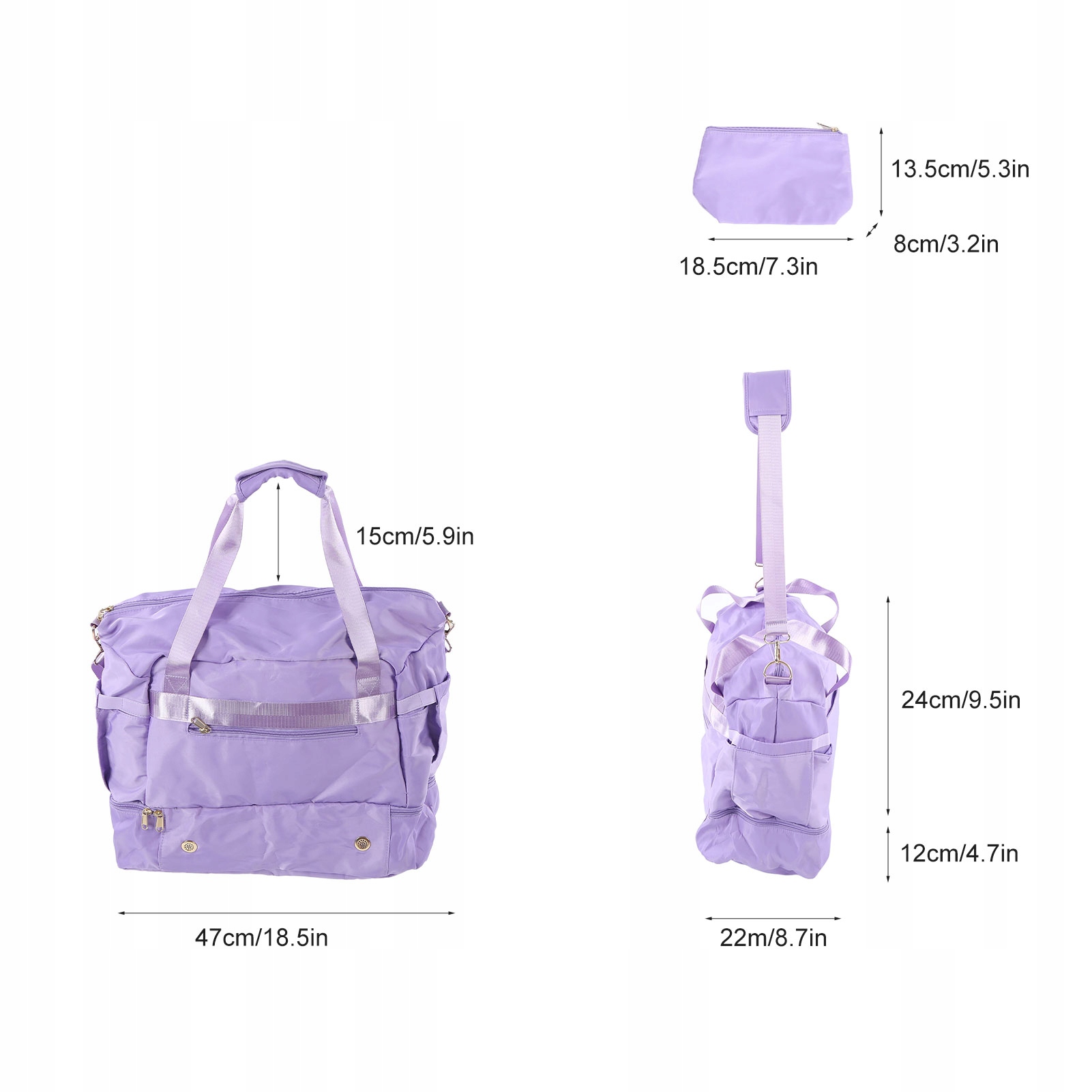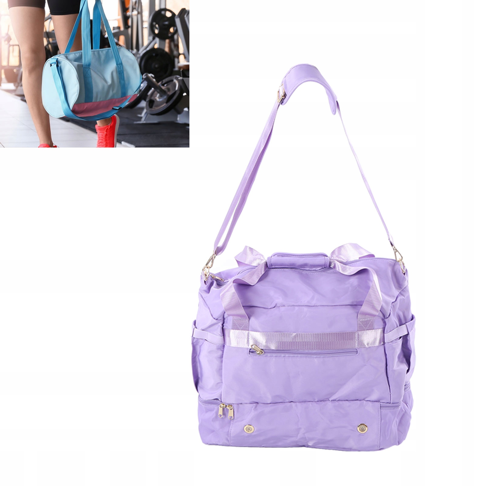 1. Будівництво великої ємності: Жіноча гімнастична сумка має простору камеру лайна та багато кишень, ідаеалі для зберігання рушників, косметики, пукук, одягу, їжі та напоїв.