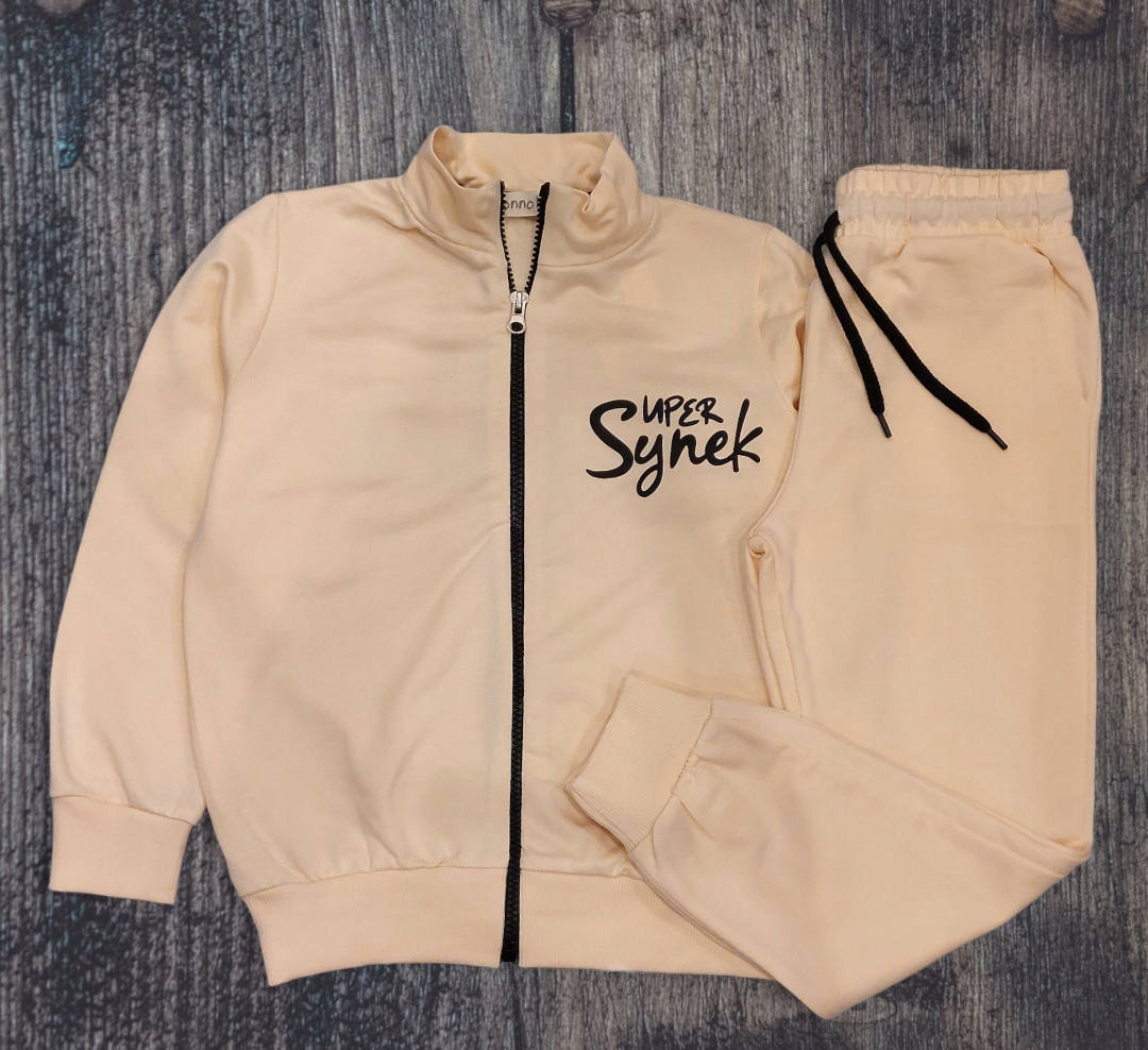 - Світшот на блискавці бежевого кольору, напис SUPER SYNEK спереду та ззаду, обробка стійкою- піднятий комір на шиї.li>