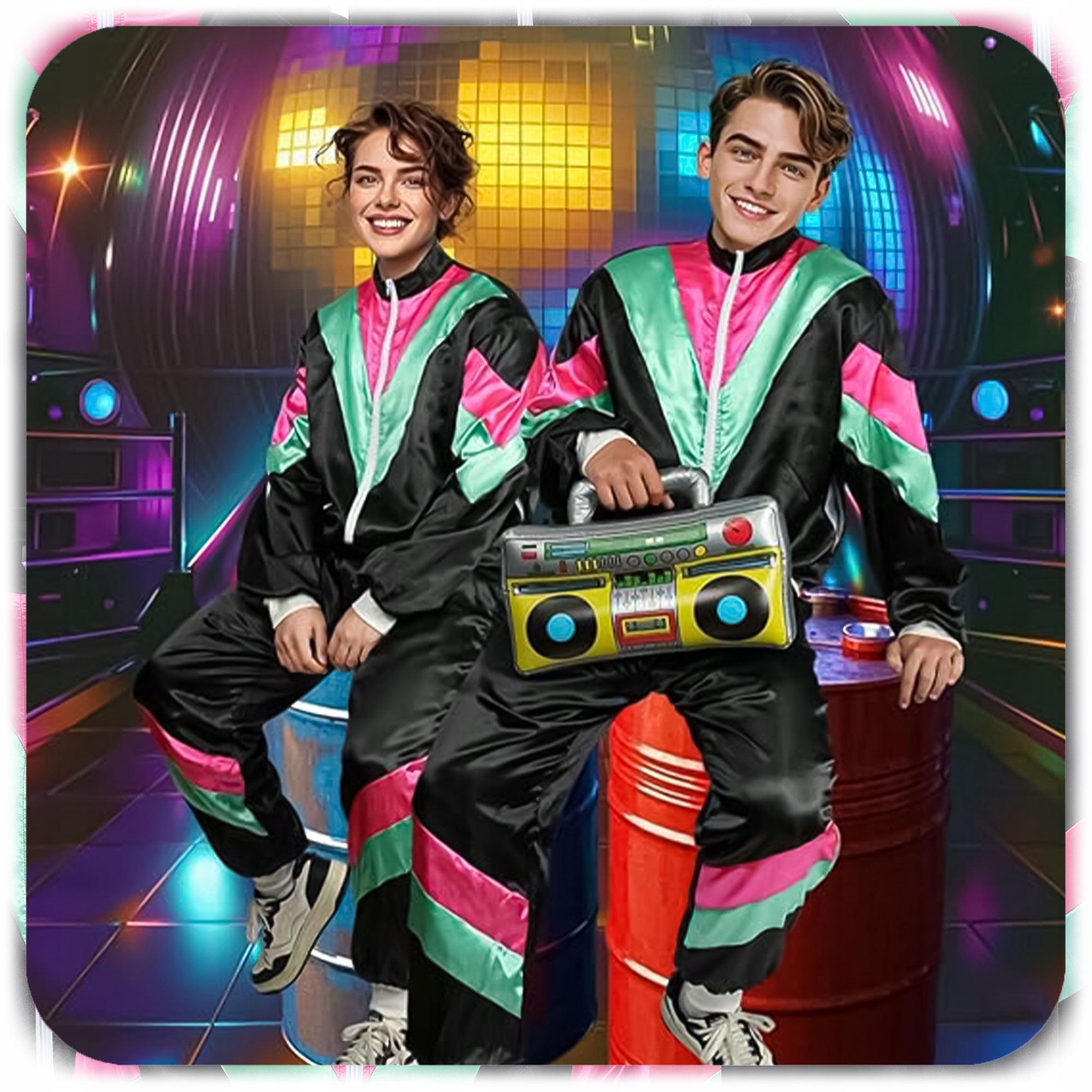 Перенесіться в культові 80-ті та відчуйте атмосферу диско! Цей модний спортивний комплект унісекс — це поєднання класичного стилю та сучасного комфорту — ідеальний як для тематичних вечірок, так і для повсякденного вуличного одягу.