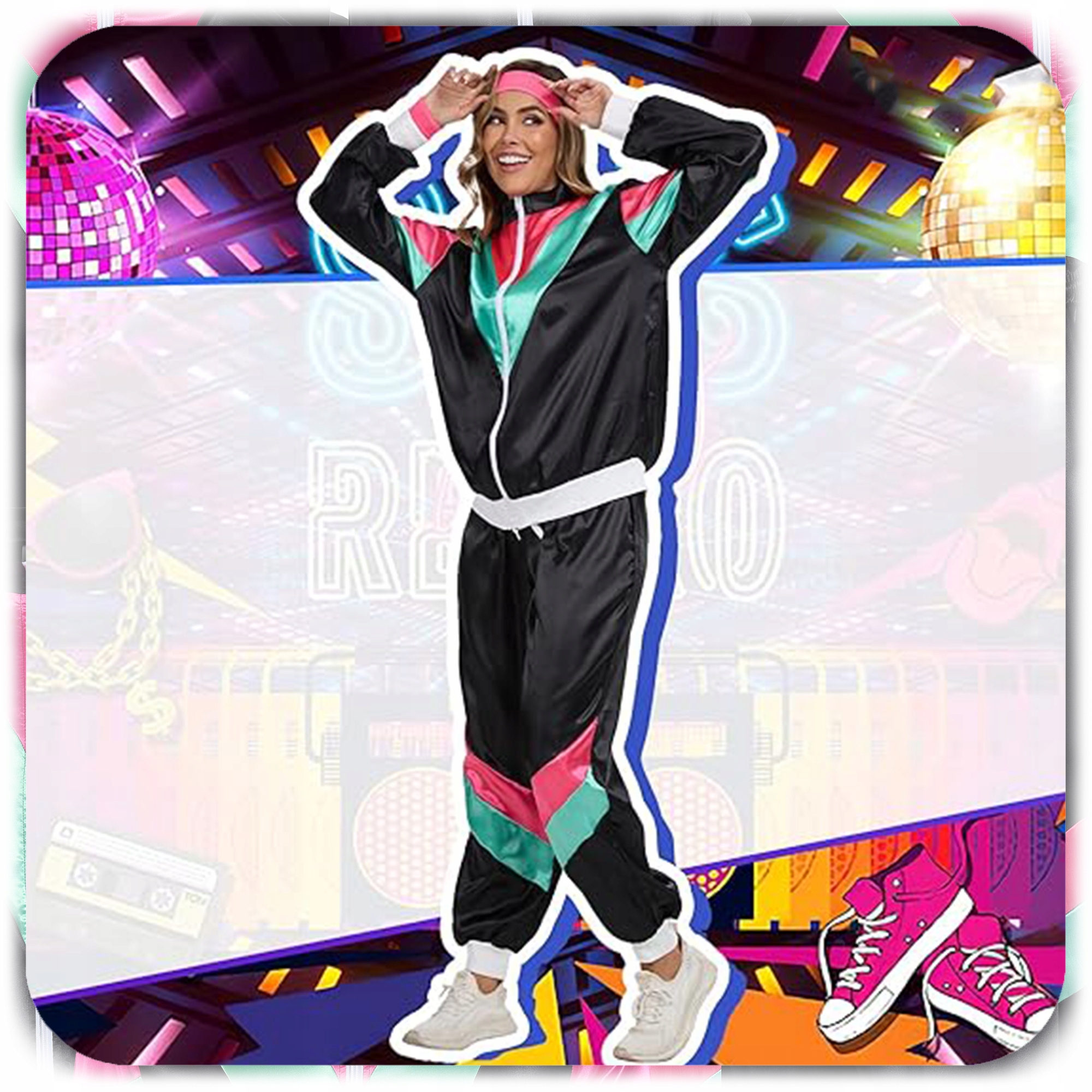 Колірна гамма – чорна з рожевими та зеленими акцентами – класика диско-моди 80-х, яка досі привертає увагу! Білі манжети на рукавах, низу куртки та штанинах додають стилю та підкреслюють ретро-характер.