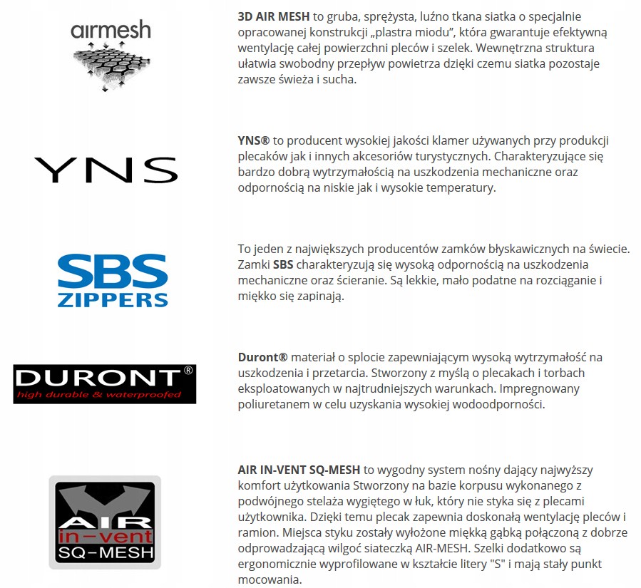 Рюкзак має повітропроникну систему для носіння на основі металевого каркаса, загнутого всередину, і сітки, натягнутої на спині. Також є зручні подушки, обшиті сіткою AIR-MESH у нижній і верхній частині спини. Система перенесення з поясом на стегнах знімається. Тоді ми отримаємо меншу вагу рюкзака, більшу місткість і можливість згорнути рюкзак. Розміри рюкзака без стегнового ременя та системи перенесення також відповідають розмірам ручної поклажі:
