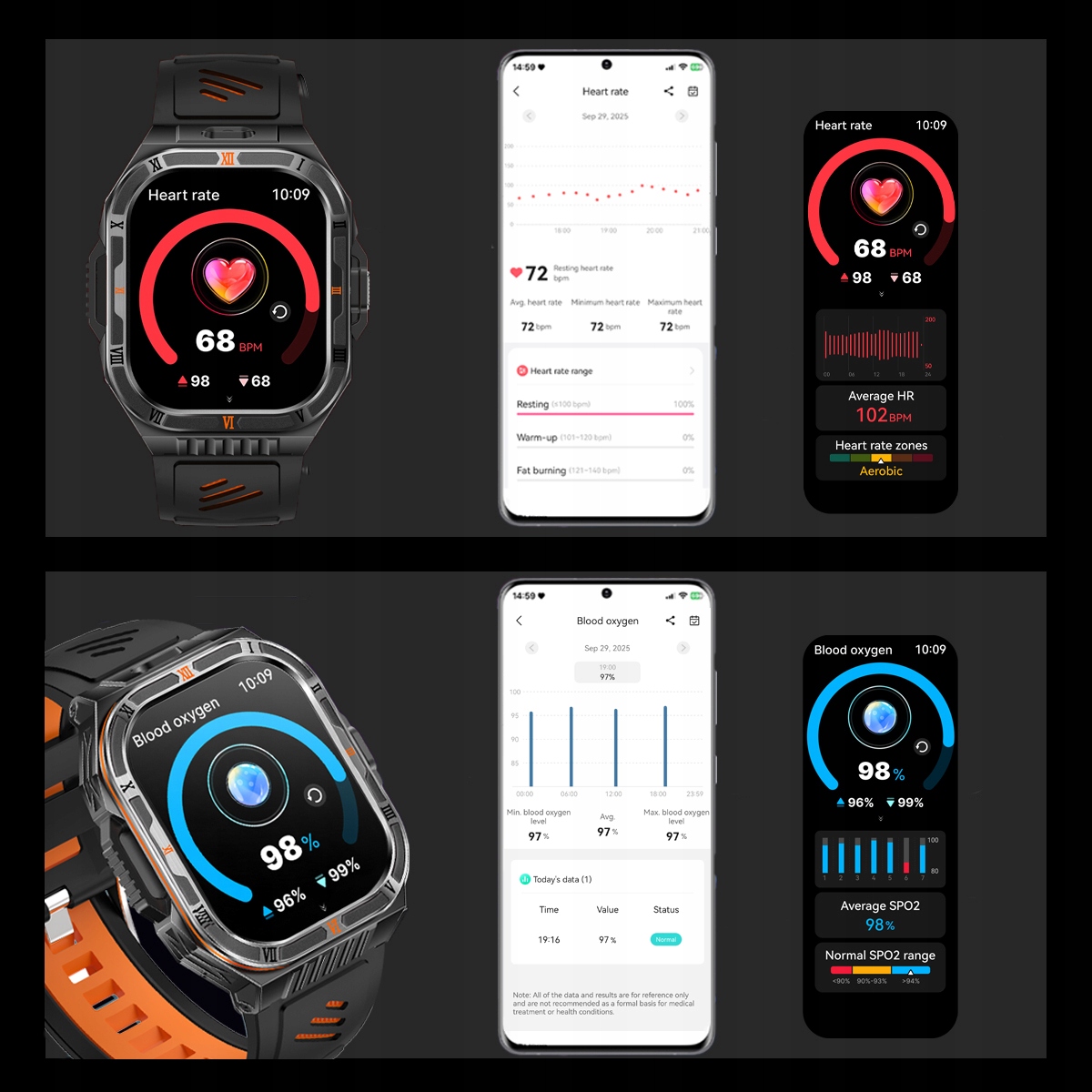 - Цілодобовий моніторинг частоти серцевих скорочень, рівня кисню в крові: контролюйте своє здоров’я за допомогою відстеження життєво важливих показників у реальному часі. Розумний годинник точно вимірює частоту серцевих скорочень під час тренувань (від інтенсивних пробіжок до легких занять йогою) і контролює рівень кисню в крові, щоб гарантувати, що ви отримуєте достатню кількість кисню - особливо важливо на великій висоті або під час інтенсивних вправ. Усі дані легко переглядати та аналізувати, допомагаючи вам приймати обґрунтовані рішення щодо вашої фізичної форми та самопочуття.