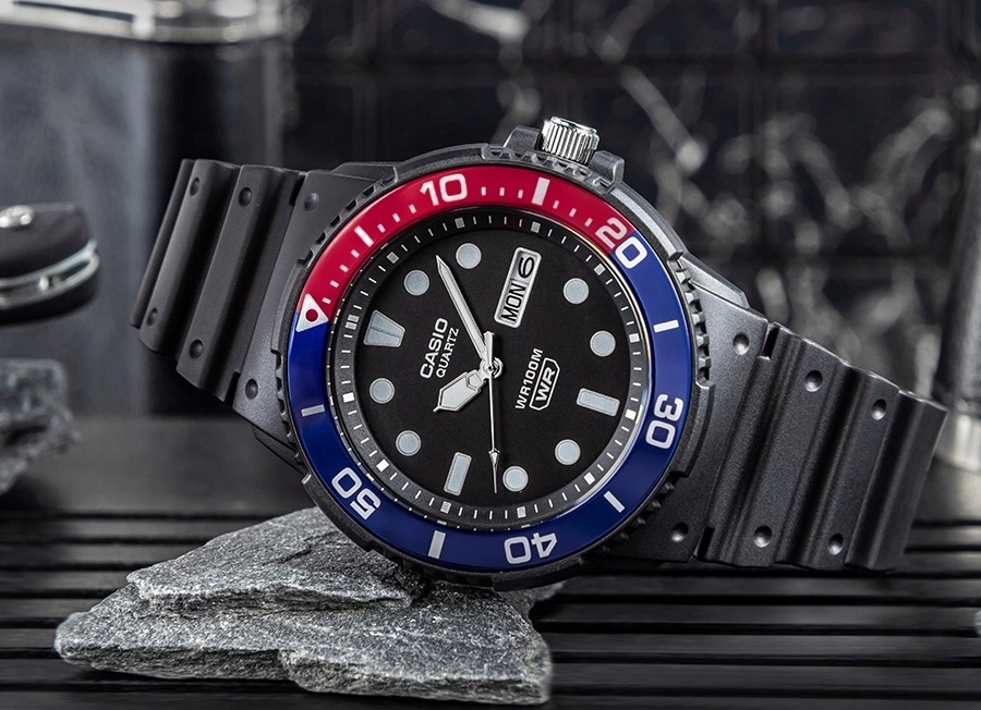 Чоловічий годинник Casio MRW-230H-1E2 працює від кварцового механізму. Чорний циферблат покритий акриловим склом. Водна стійкість 10 атм (100 м) дозволяє вільно плавати. Острововик встановлений на чорному ремінці, виготовленому з міцного та зручного пластику. Руки (година і хвилина) покриті шаром необриту, який корисно для читання поточного часу після темряви. Додатковою перевагою моделі MRW-230H-1E2 є практичний дисплей дати, що вказує на поточний день тижня та місяця. Модний дизайн дайвера з обертовою рамкою.