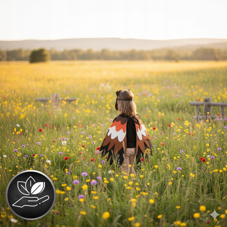 Фетрові крильця, які легко надягати дитині завдяки еластичним гумкам на руках. Їх можна зав’язати на спині для комфортного носіння та свободи рухів — ідеально підходить для польотів і крилатих пригод!