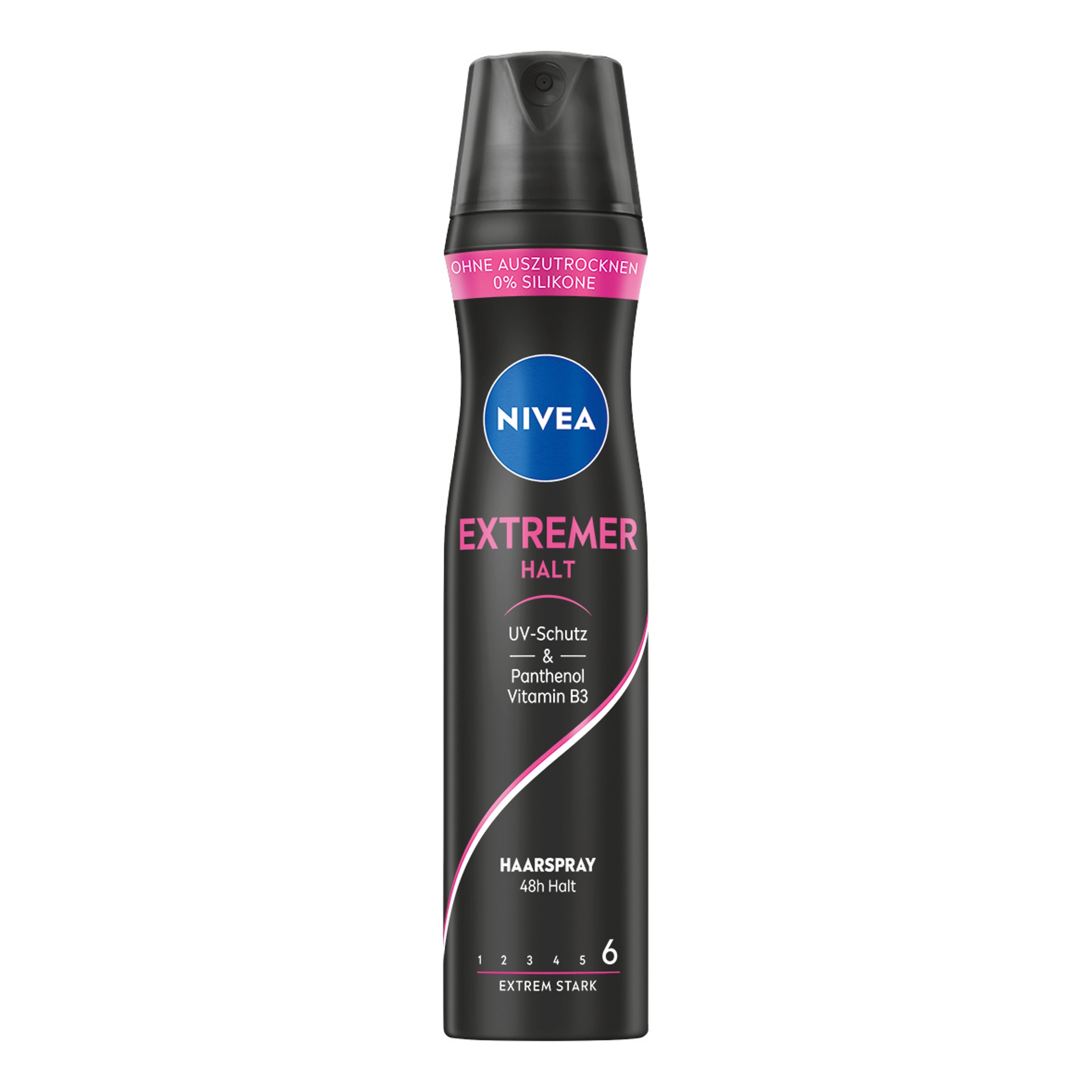 Лак для волосся NIVEA Extreme Hold. Покращена формула з пантенолом і вітаміном В3 зміцнює і захищає ваше волосся. Лак для волосся забезпечує винятково сильний контроль над укладанням, зміцнює волосся до 48 годин і захищає від ультрафіолетового випромінювання. Лак живить волосся, не пересушуючи його. Його легко розчісувати. Він забезпечує волоссю силу і захист, зачіска тримається багато годин, а волосся залишається приємним на дотик і зберігає свіжий і здоровий вигляд. Не забувайте підтримувати своє волосся в хорошому стані, використовуючи засоби догляду, призначені для вашого типу волосся. Також спробуйте інші засоби для укладання волосся від NIVEA.