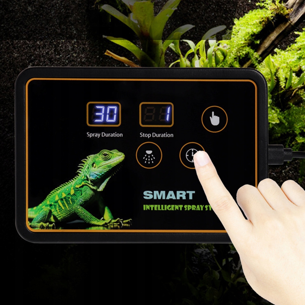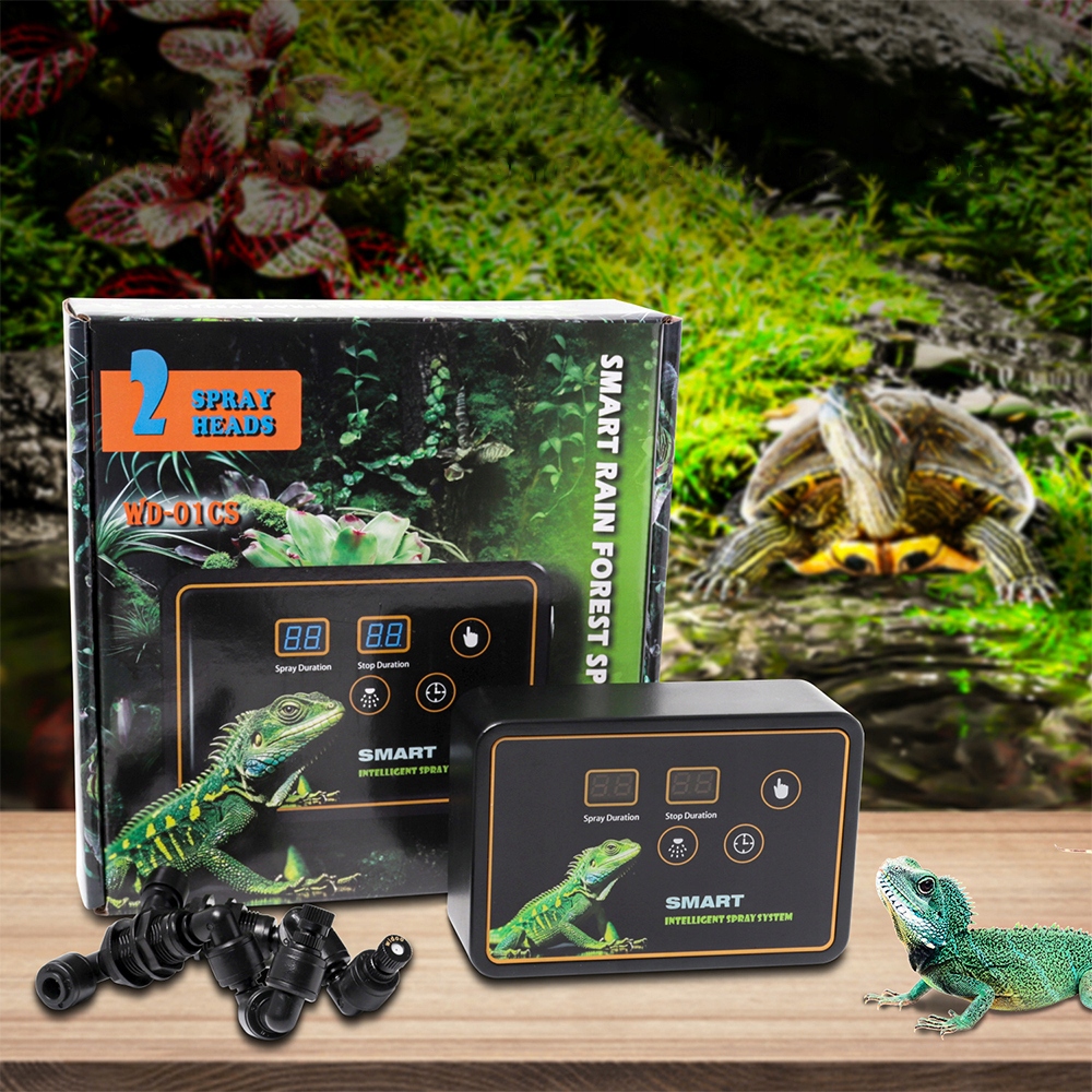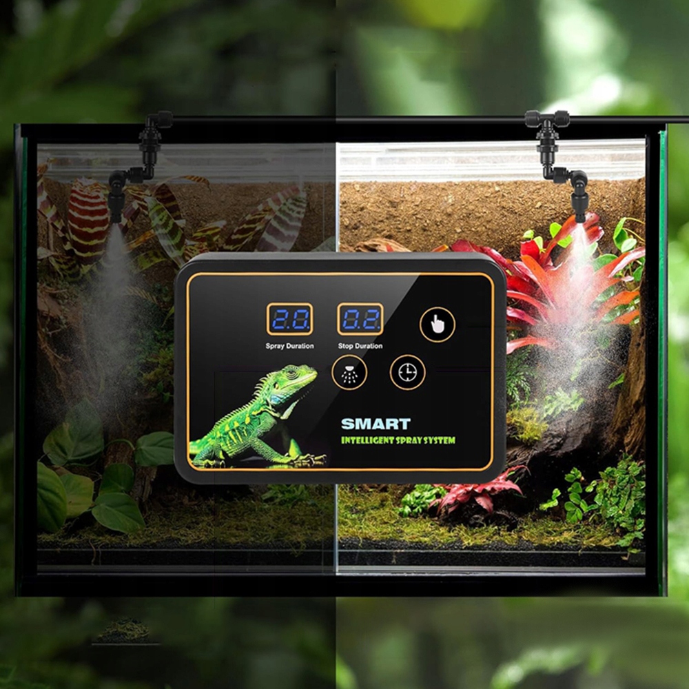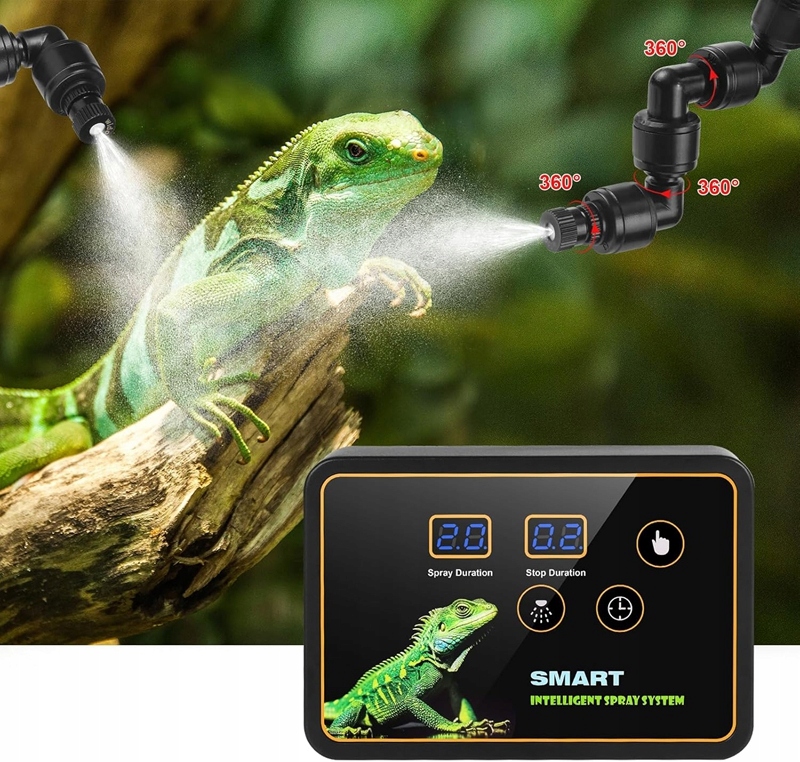Інтелектуальна спринклерна система оснащена двома повністю регульованими на 360° форсунками, які спрямовують потік води в усіх напрямках, швидко зволожуючи тераріум. Система відтворює природний клімат тропічного лісу, забезпечуючи рептиліям і амфібіям комфортні умови та покращуючи якість їхнього життя.