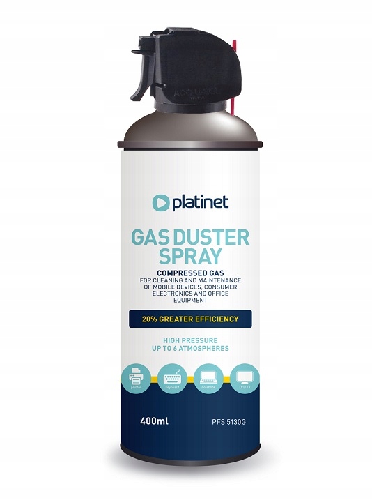 Стиснене повітря для чищення електронних пристроїв Platinet видаляє пил із важкодоступних місць, де не можна використовувати вологе прибирання. Рекомендовано для чищення: касових апаратів, комп'ютерів (чистка клавіатури, внутрішніх частин корпусу комп'ютера), оргтехніки, копіювальної техніки, принтерів, фототехніки, приладів точної механіки та телекомунікаційних пристроїв. Пил та інші забруднення видуваються під високим тиском, не залишаючи слідів очищення. Стиснене повітря Paltinet дуже простий у використанні, а завдяки приєднаній капілярній трубці можна точно направити сильний газовий потік на забруднене місце.