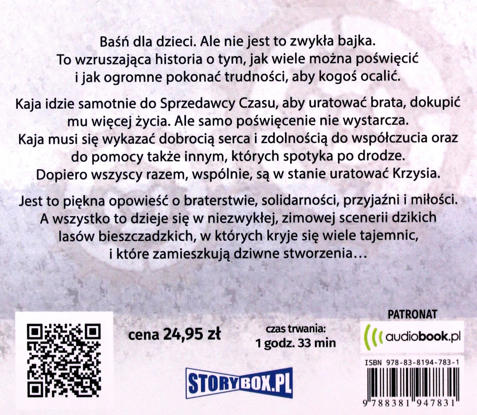 Казка для дітей. Але це не звичайна казка. Це зворушлива історія про те, як багато можна пожертвувати і які великі труднощі можна подолати, щоб врятувати когось. Кая сама йде до Торговця часом, щоб врятувати свого брата та купити йому більше життя. Але самої жертви недостатньо. Кая повинна продемонструвати доброту свого серця та здатність співчувати та допомагати іншим, яких вона зустрічає на своєму шляху. Тільки всі разом можуть врятувати Кшиша. Це прекрасна історія про братерство, солідарність, дружбу та любов. І все це відбувається в надзвичайних зимових пейзажах диких Бещадських лісів, які приховують багато таємниць і населені дивними створіннями?