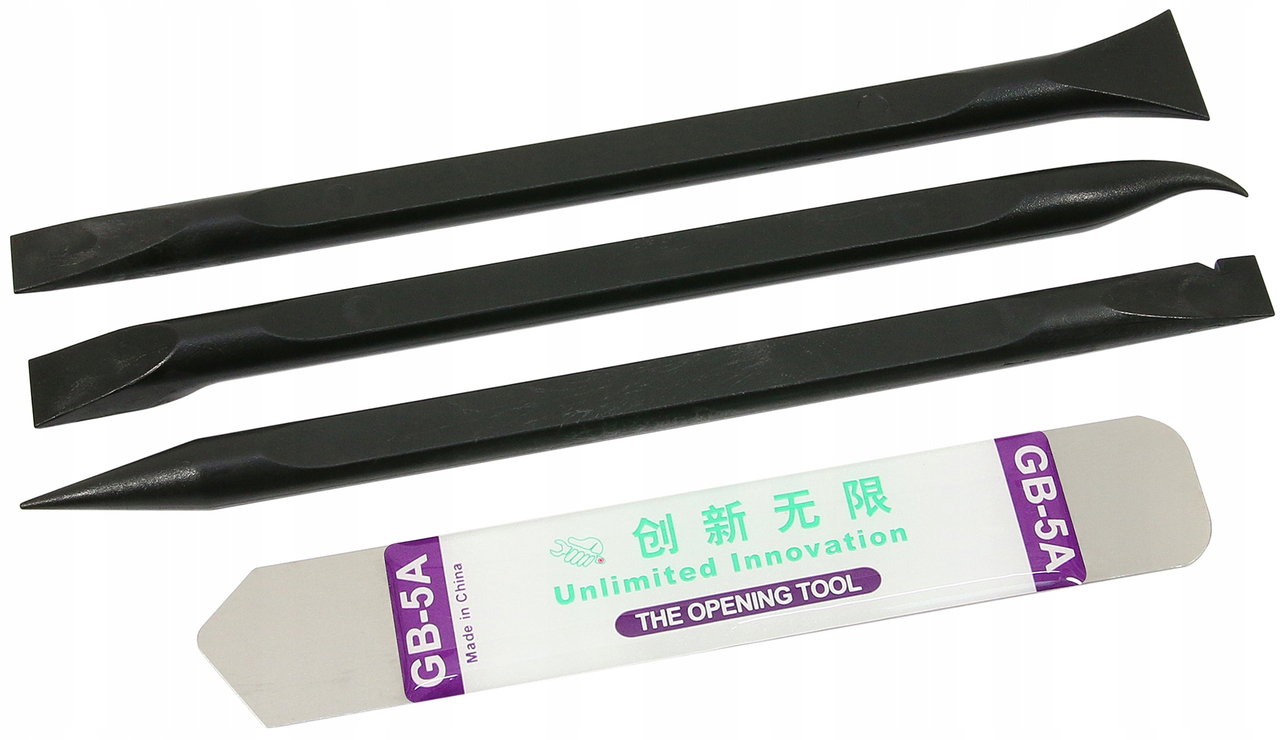 Набір складається з 3 універсальних антистатичних відкривачок для відкриття всіх корпусів телефонів, ноутбуків та іншої електронної техніки та металевої відкривачки GB-5A.