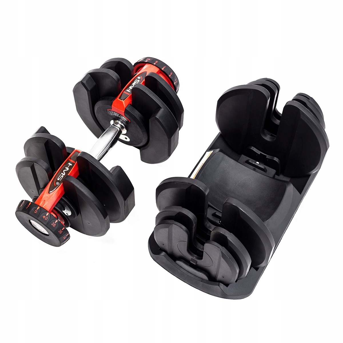 SR80 HMS – це регульована гантель. У комплект входить гриф, 10 тарілок і підставка. Пристрій є ідеальним рішенням для людей, які займаються вдома, але він також добре працюватиме в тренажерному залі, замінюючи всю стійку традиційних гантелей.