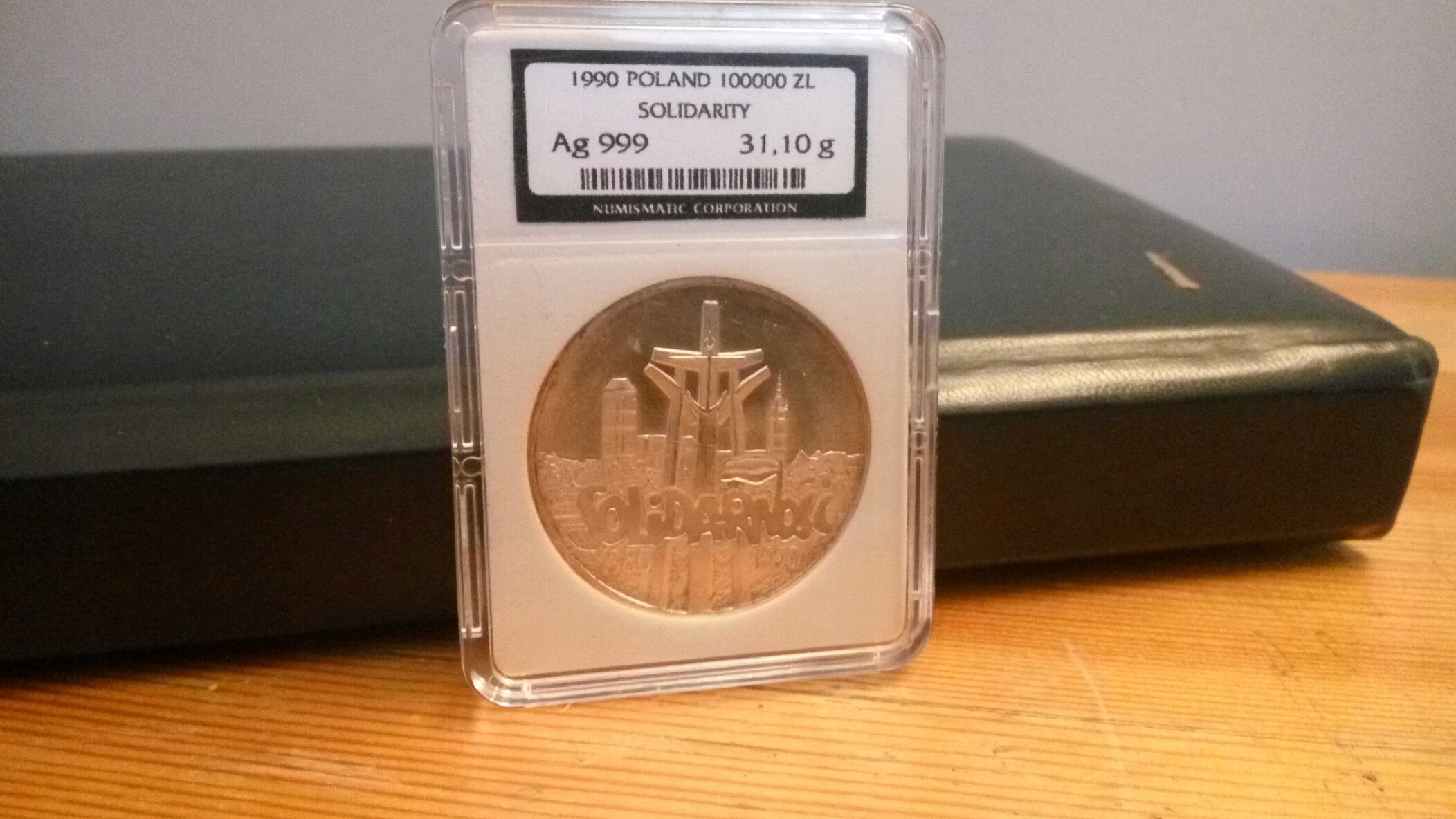 Srebrna Moneta 100000 zł Solidarność 1990 r, typ A, 31,1g Ag 999 SREBRO