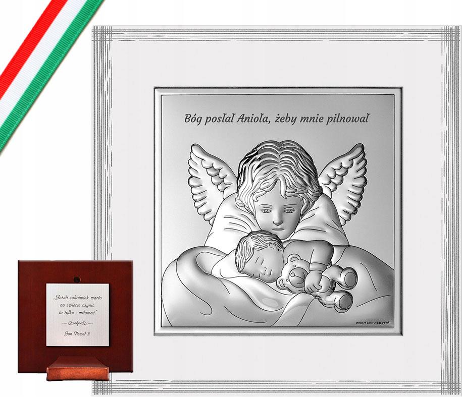 Srebrny obraz w kwadracie z aniołem stróżem i tekstem 24x24cm na chrzest