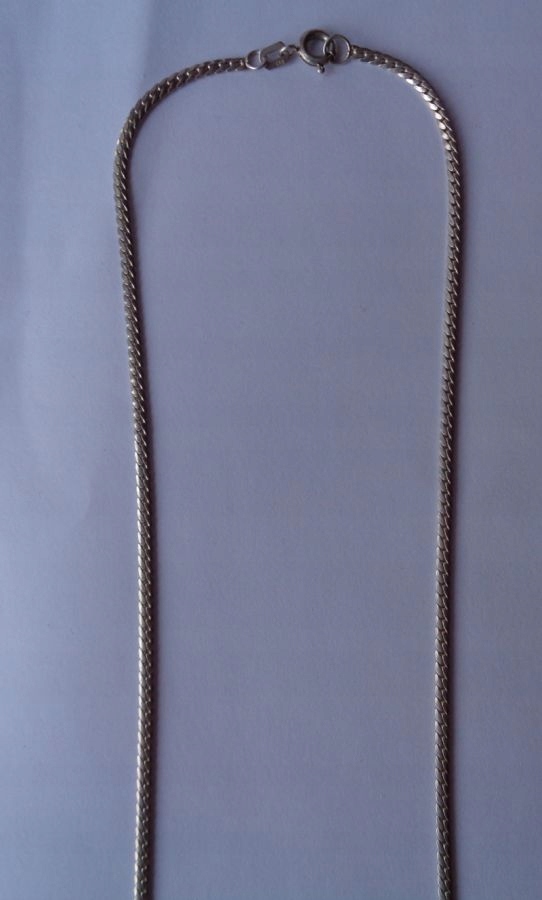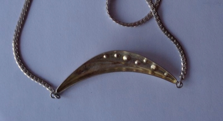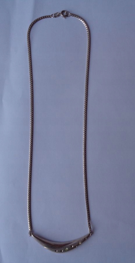 Гарне, елегантне, декоративне намисто з підписом. Експонат має елегантне, точне ланцюгове плетіння. Ланки ланцюга мають тонку структуру. Підвіска в кольє має місячну форму і форму. Він прикрашений цікавими прикрасами зі срібла та двома красиво ограненими цирконами. Орнаменти на кулоні у вигляді крапок і ліній. Срібло 835 проби, на фото видно підпис. Експонат має надійну застібку. Підходить для будь-якого випадку. Рекомендую всім.