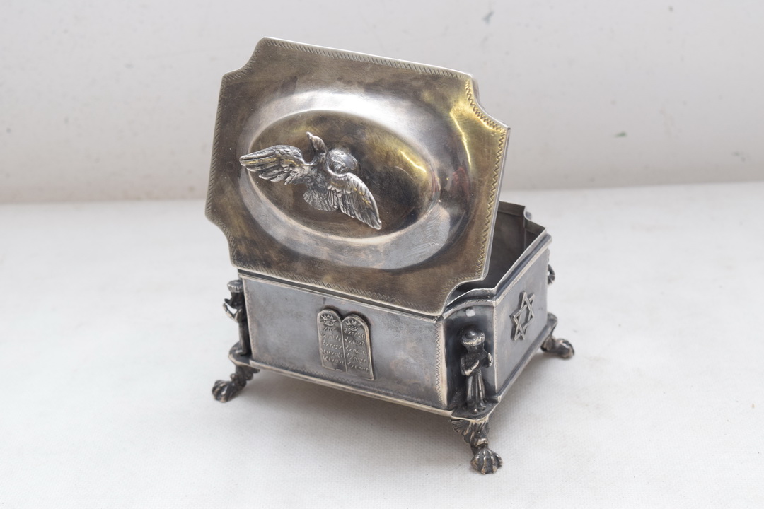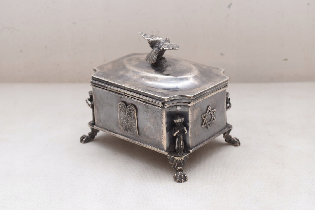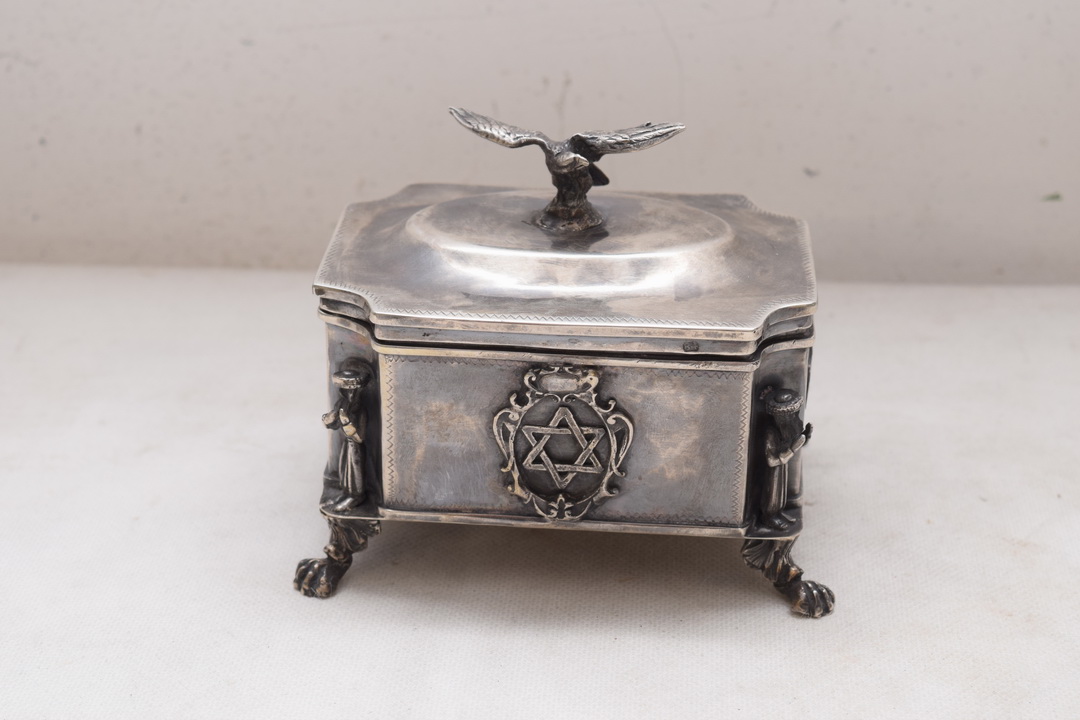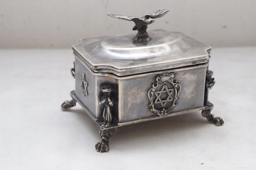 Красива цукерниця XIX століття, що нагадує коробку, підтримується на чотирьох ніжках профільованою кришкою, встановленою на петлі. Кришку цукорниці вінчає величний орел - теж зі срібла. Срібло надзвичайно багато гравіроване, інтер’єр полірований позолотою. На боках цукорниці багато юдейських прикрас.