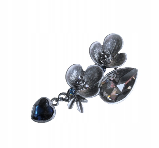 Унікальна брошка з квітами, наповненими сірими цирконами, додаванням великого димчастого циркону у формі сльози та висячого серця з темно-синім цирконом