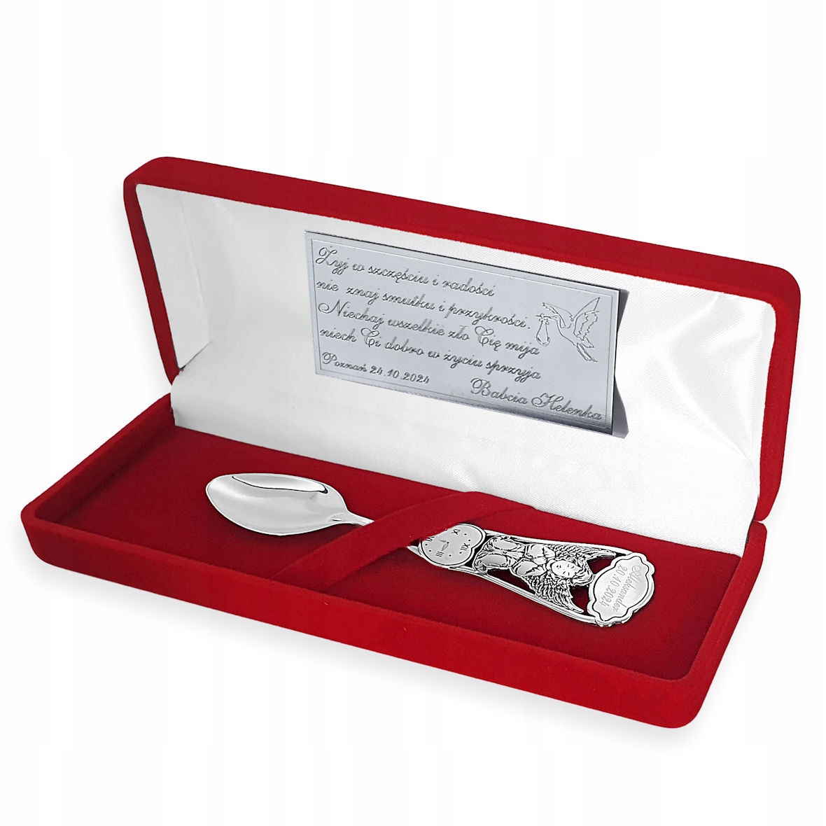 Срібна ложка Ангел для хрещення з гравіюванням в коробочці з присвятою.
