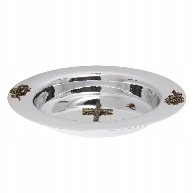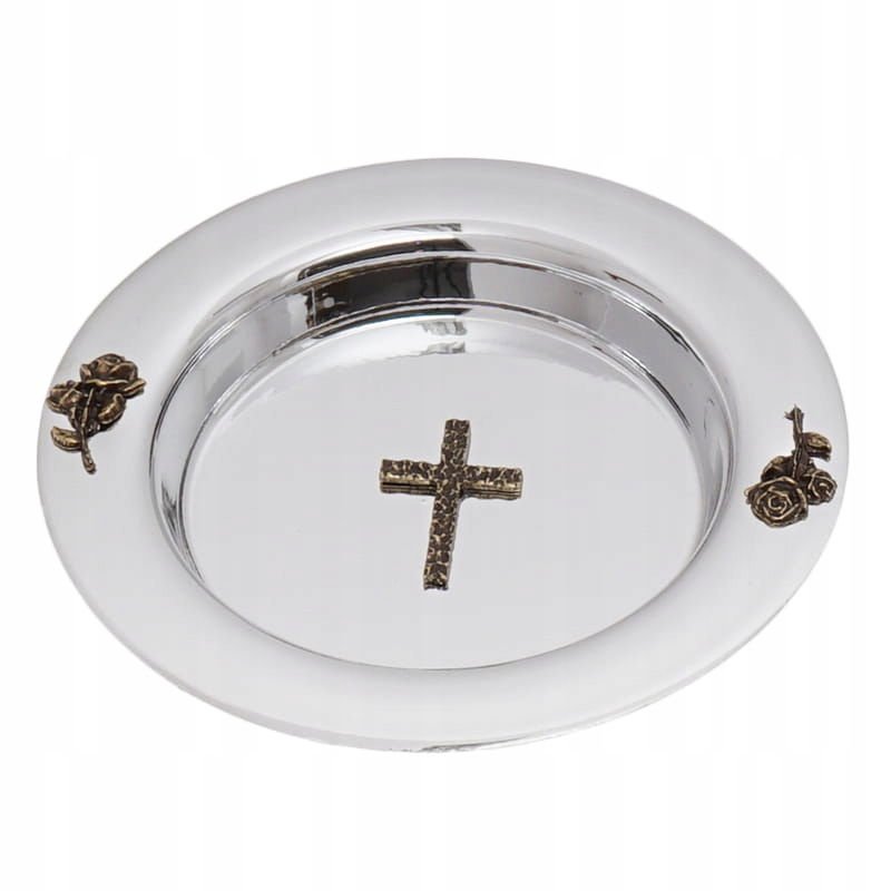 Посудина сріблястого кольору для святої води, пластикова, діаметром приблизно 12 см.