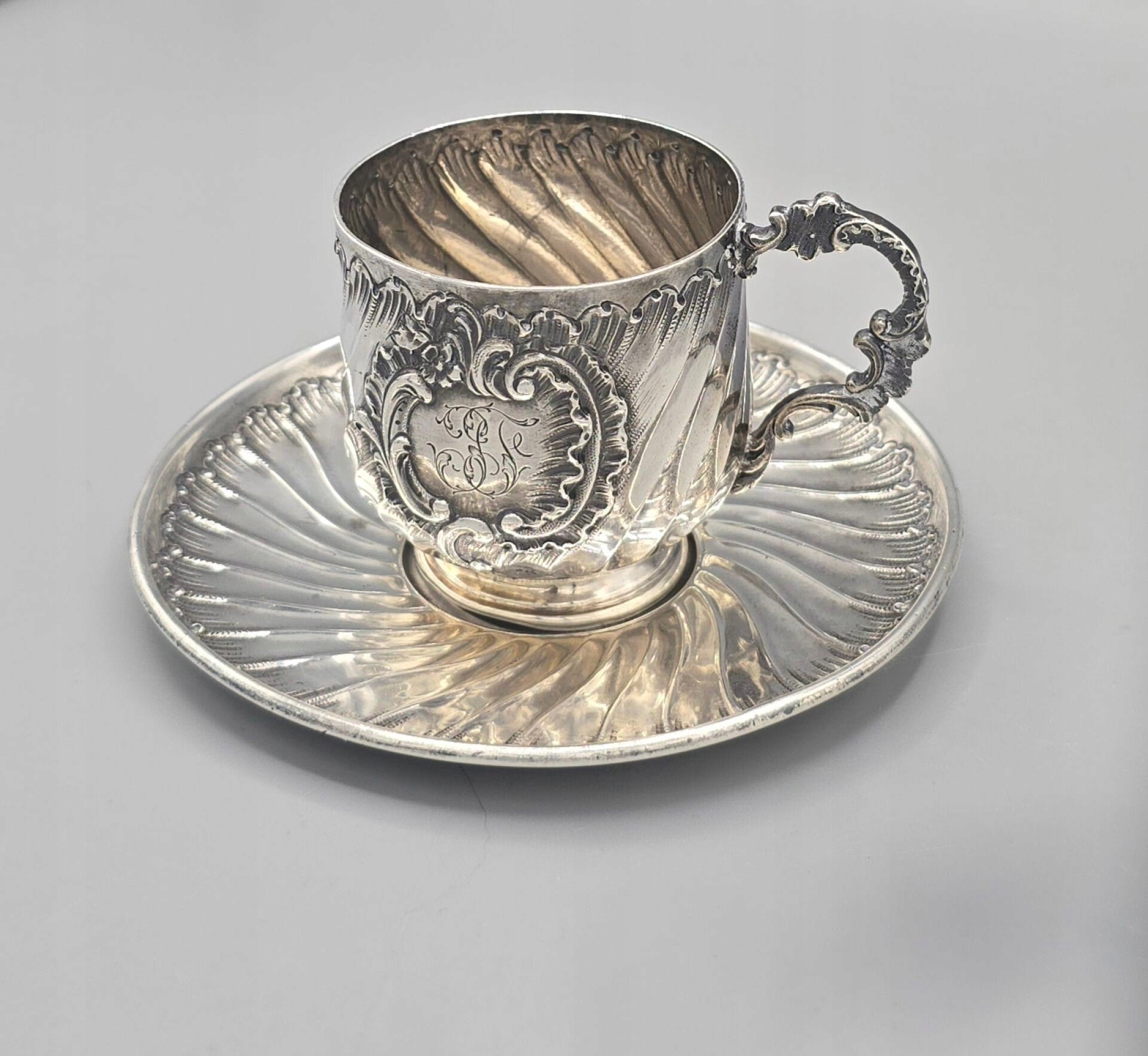 Срібна, кругла чашка зі срібним блюдцею, хитро оформлена. Франція 19 століття. 4
