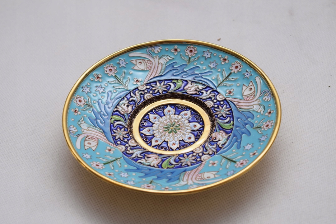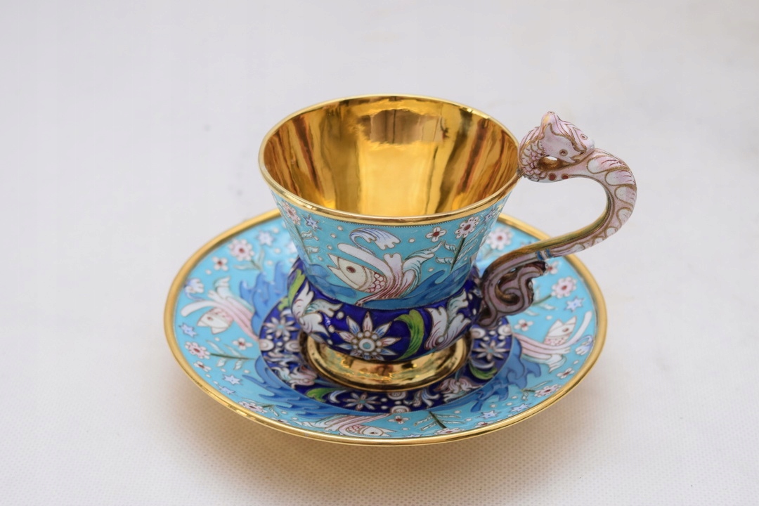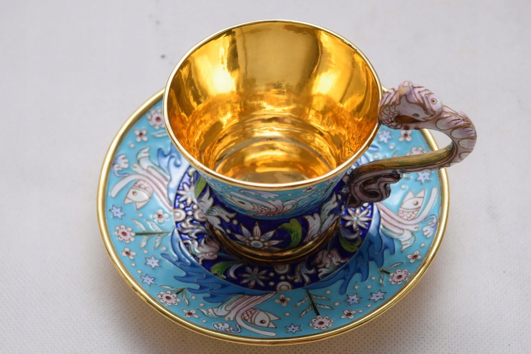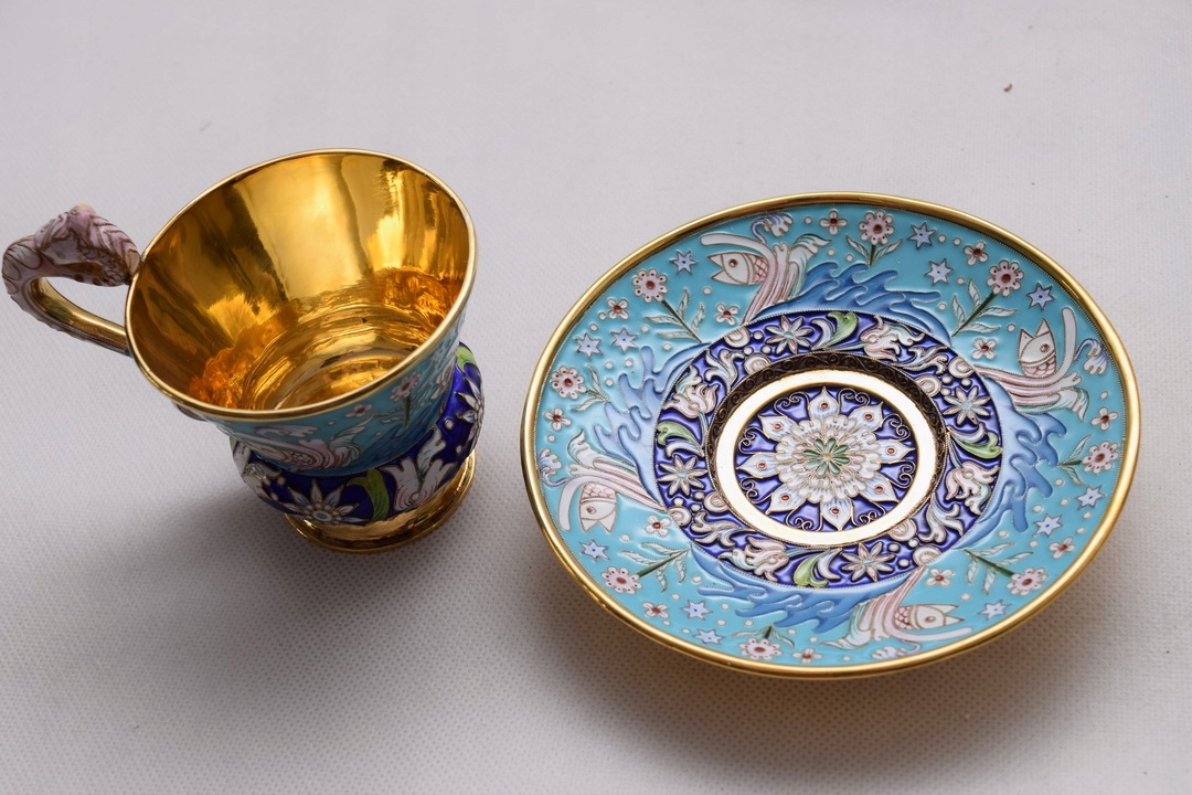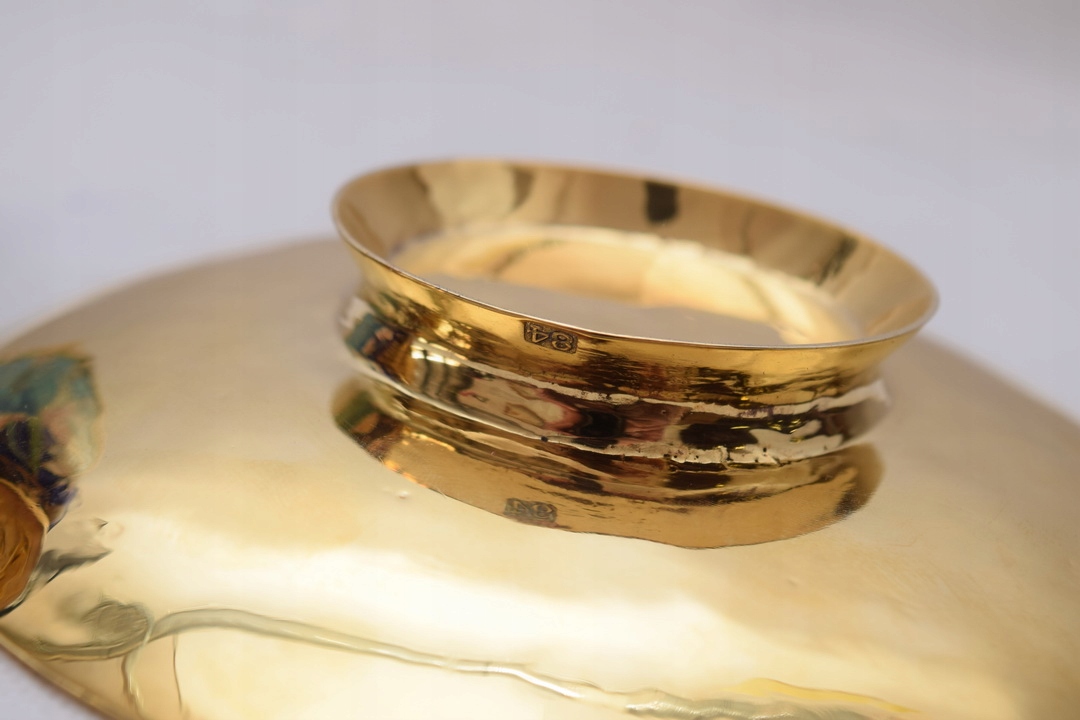 Тільне позолочене срібло, прикрашене різнокольоровою комірчастою емаллю навколо.