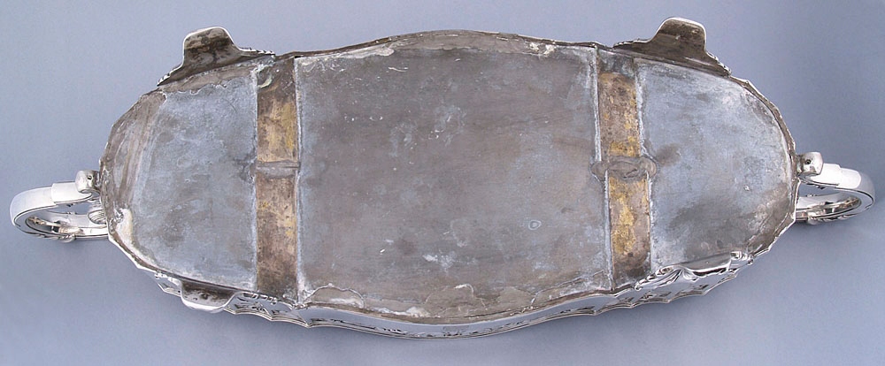 увінчаним короною з сімома жезлами, що є атрибутом барона, схожим за формою на овальний, спирається на чотири ніжки. На вужчих сторонах дві вигнуті ручки, прикрашені листям аканта. Спереду, на дещо заокругленому та більш високому полі, є листя репуссе, розташовані у флер-де-ліс посередині, під родинним гербом барона, що зображує грифона, руку з пером і два мальтійські хрести, а над ним корона з сімома палицями. З кожного боку є шість увігнутих вертикальних смуг із квадратним полем у верхній частині, що містить вигравірувані листя. Масивні ніжки також у вигляді з'єднаних листочків. З нижньої сторони є дві смужки, що зміцнюють нижню частину жардиньєрки, а також клейма срібла 800 проби та номер 70145, а також клейма золотаря Ф. Дж. Шредер. Всередині пізніша повністю посріблена мідна вставка.