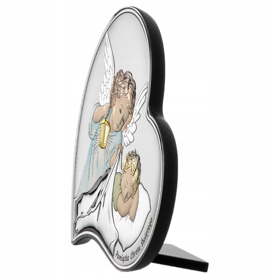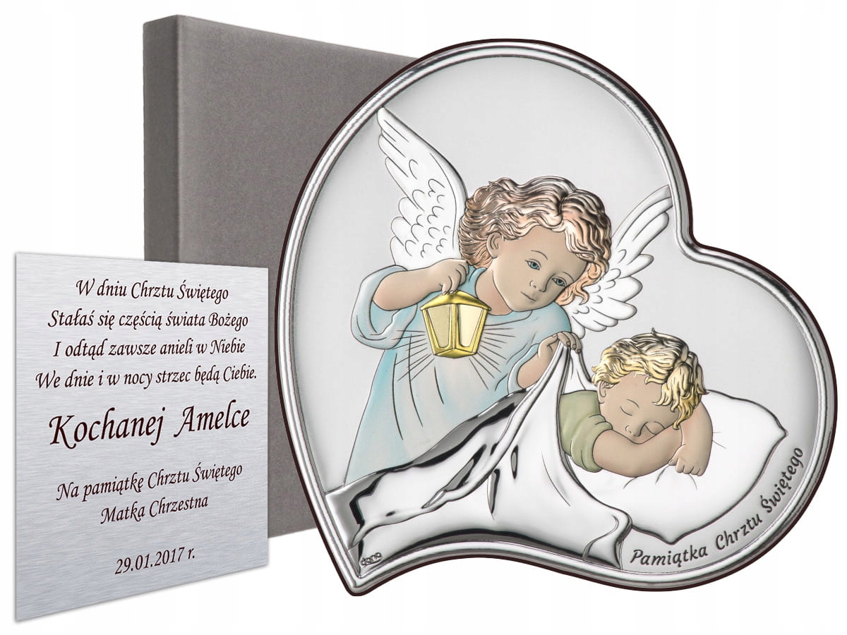 Ексклюзивна срібна картина, додатково розфарбована фрагментами, торгової марки , італійського виробника сувенірної продукції зі срібла. На малюнку у формі серця зображено Ангел-охоронець з ліхтариком. Внизу малюнка напис «Сувенір Святого Хрещення». Така картина є унікальним подарунком чи сувеніром на особливу подію, наприклад, на Святе Хрещення.