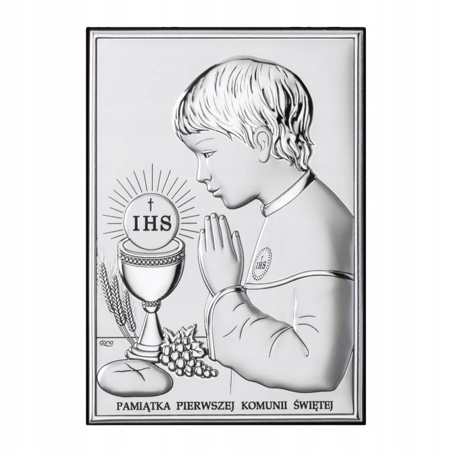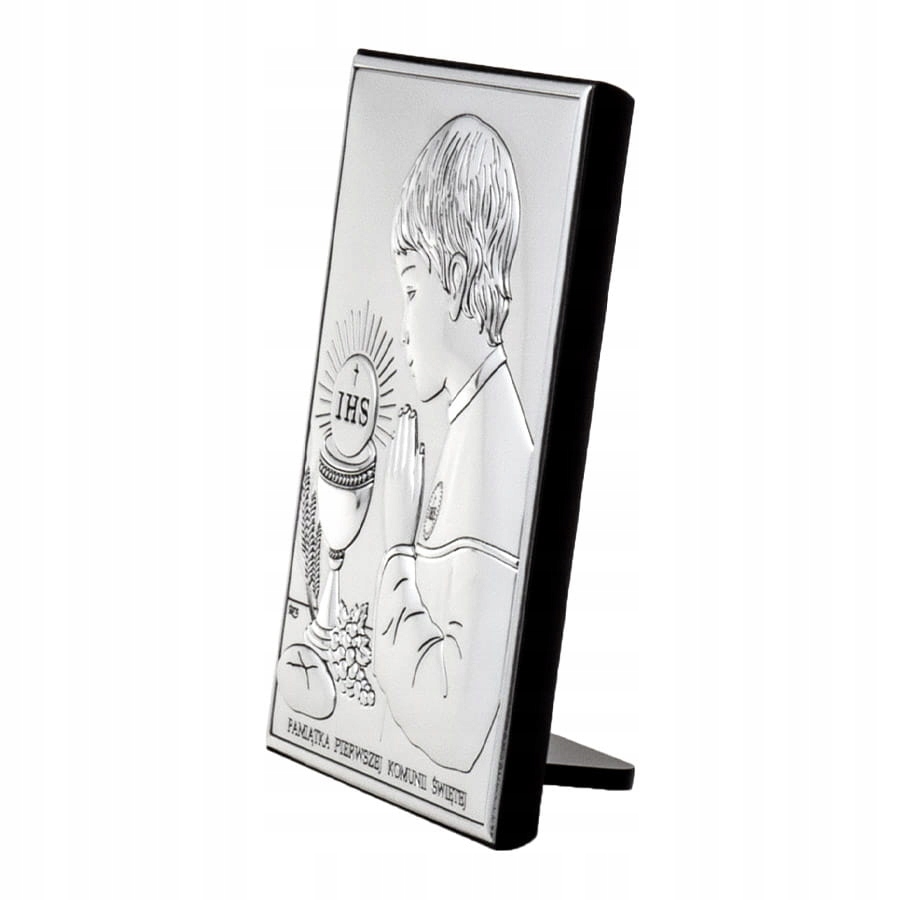Ексклюзивна срібна картина, бренд ,, італійський виробник сувенірної продукції зі срібла. На прямокутному малюнку зображено хлопчика, який приймає Перше Святе Причастя. Внизу малюнка напис «Сувенір Першого Святого Причастя». Така картина є унікальним подарунком або сувеніром для хлопчика на особливу подію, наприклад, Перше Причастя.