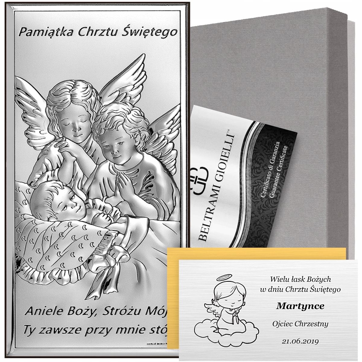 Срібна картина для хрещення із зображенням ангела з ліхтариком, що схилився над сплячою дитиною, і написом «Сувенір Святого Хрещення».
