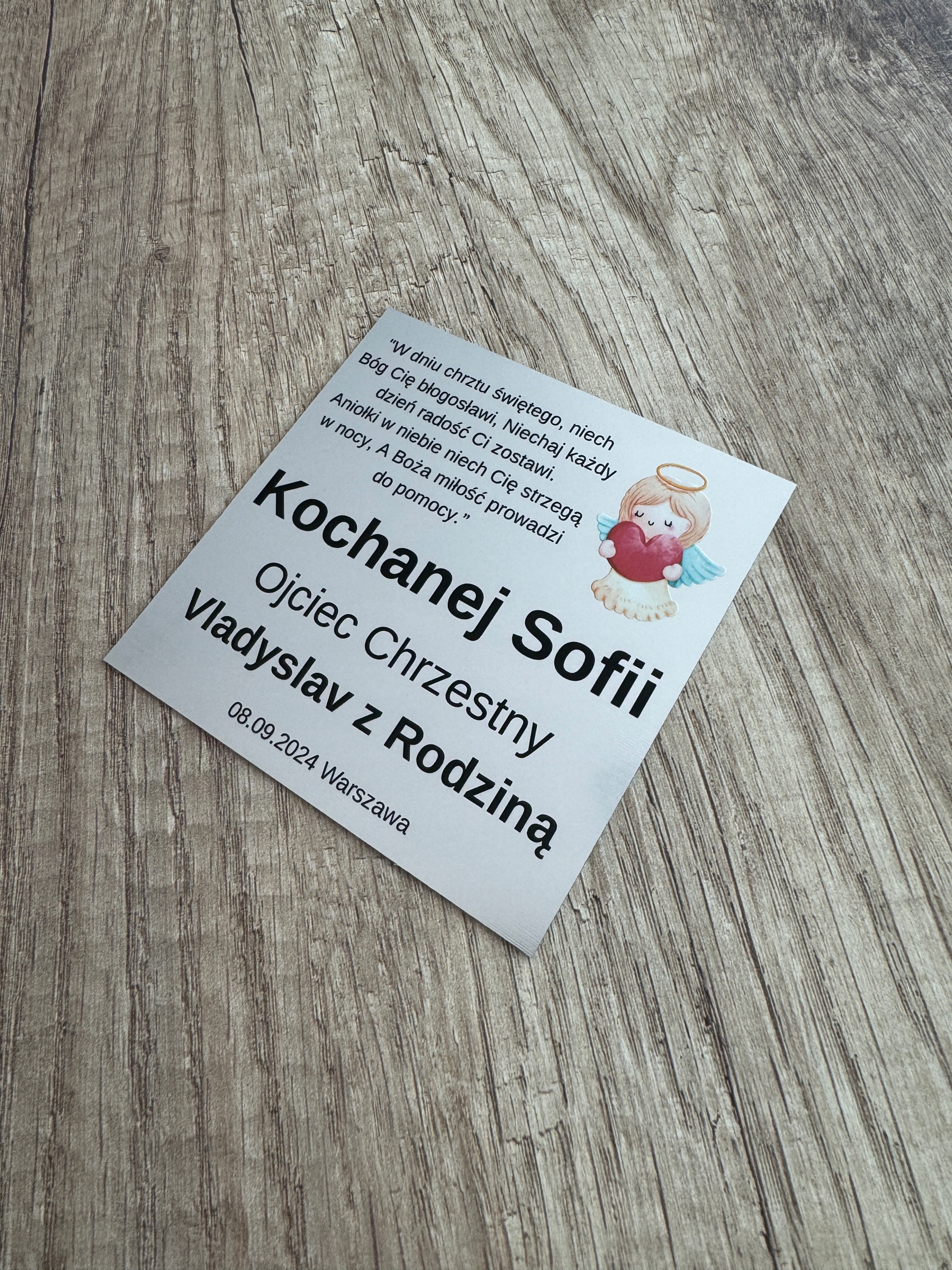 Будь ласка, виберіть дизайн від 1 до 12і ІМ'Я ДИТИНИ/НАРЕЧЕНОЇ ТА ГРУПИ, напр. Мартинка, КОГО ПОДАРУНОК, напр. Хрещений батько, ДАТА І/АБО МІСЦЕ, напр. Люблін, 05.07.2024 р.