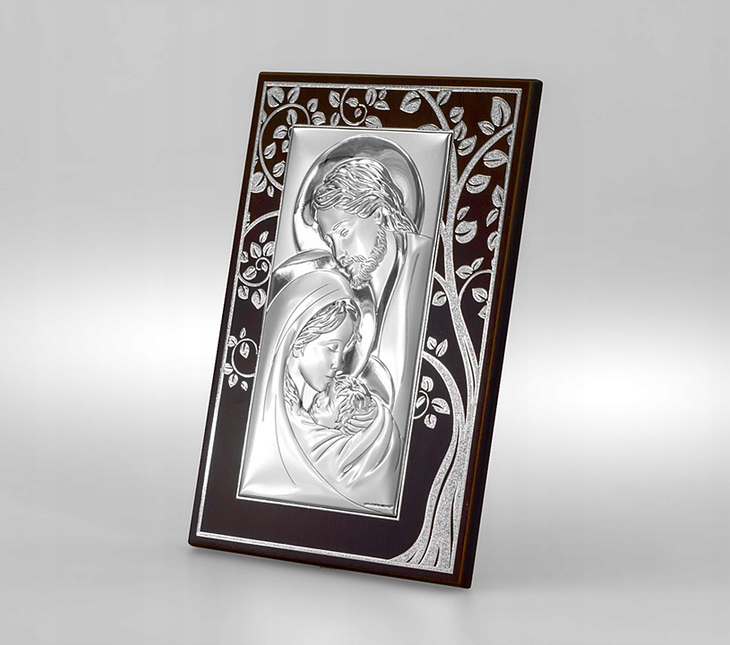 Елегантне срібло гравірована картина із зображенням Пресвятої родини з Немовлям, розміщена на темному дереві з мотивом дерева. Ідеальний весільний сувенір від батьків для нареченого і нареченої або до річниці таїнства шлюбу для близьких, а також для багатьох інших випадків, таких як Хрещення, Причастя чи Миропомазання.
